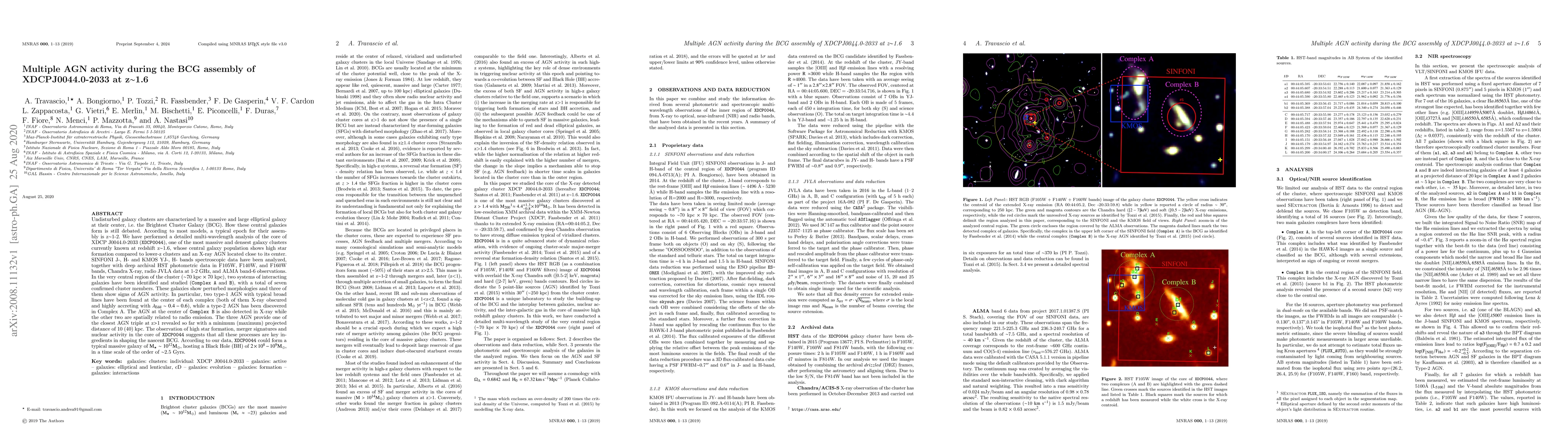 This paper investigates the assembly of the Brightest Cluster Galaxy (BCG) in the massive galaxy cluster XDCPJ0044.0-2033 at z~1.6, revealing multiple active galactic nuclei (AGN) in the central region. The study identifies three AGN, including two type-1 AGN and one type-2 AGN, suggesting that star formation, mergers, and nuclear activity are crucial for the formation of a massive BCG.