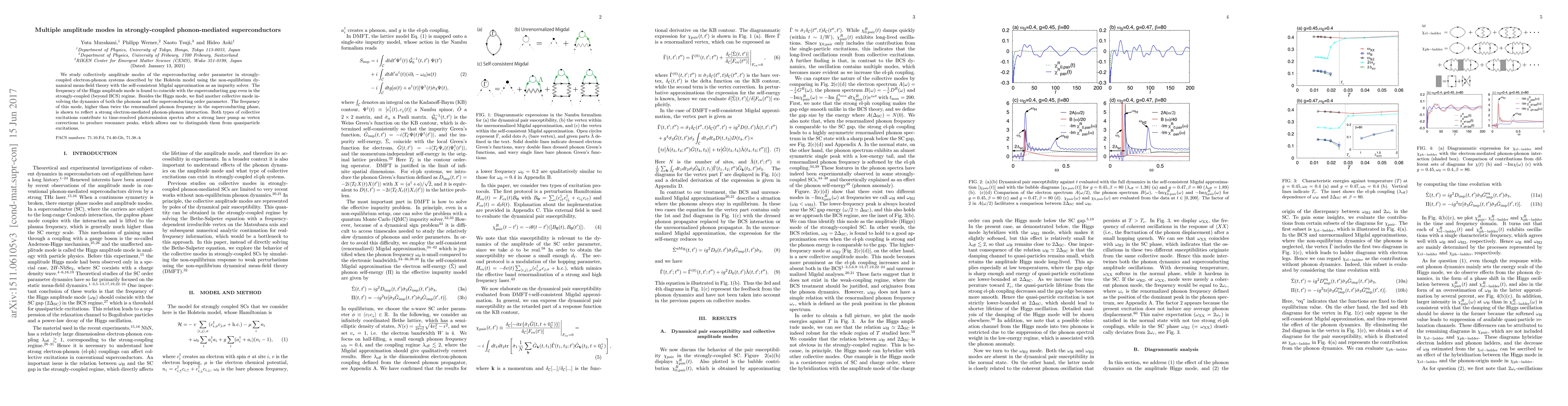 This paper investigates collective amplitude modes in strongly-coupled phonon-mediated superconductors using nonequilibrium dynamical mean-field theory. It reveals a Higgs mode frequency coinciding with the superconducting gap and a higher-frequency mode reflecting strong electron-mediated phonon-phonon interactions, both observable in time-resolved photoemission spectra.