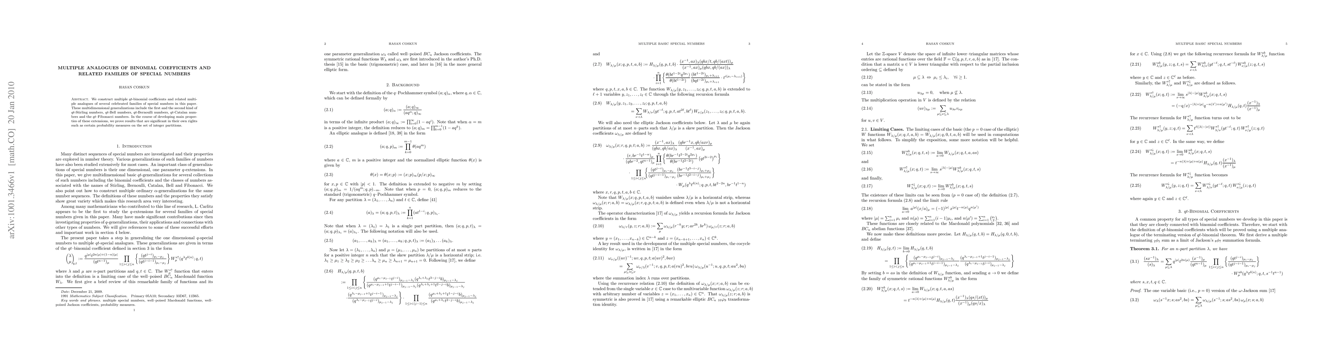 We construct multiple $qt$-binomial coefficients and related multiple analogues of several celebrated families of special numbers in this paper. These multidimensional generalizations include the first and the second kind of $qt$-Stirling numbers, $qt$-Bell numbers, $qt$-Bernoulli numbers, $qt$-Catalan numbers and the $qt$--Fibonacci numbers. In the course of developing main properties of these extensions, we prove results that are significant in their own rights such as certain probability measures on the set of integer partitions.