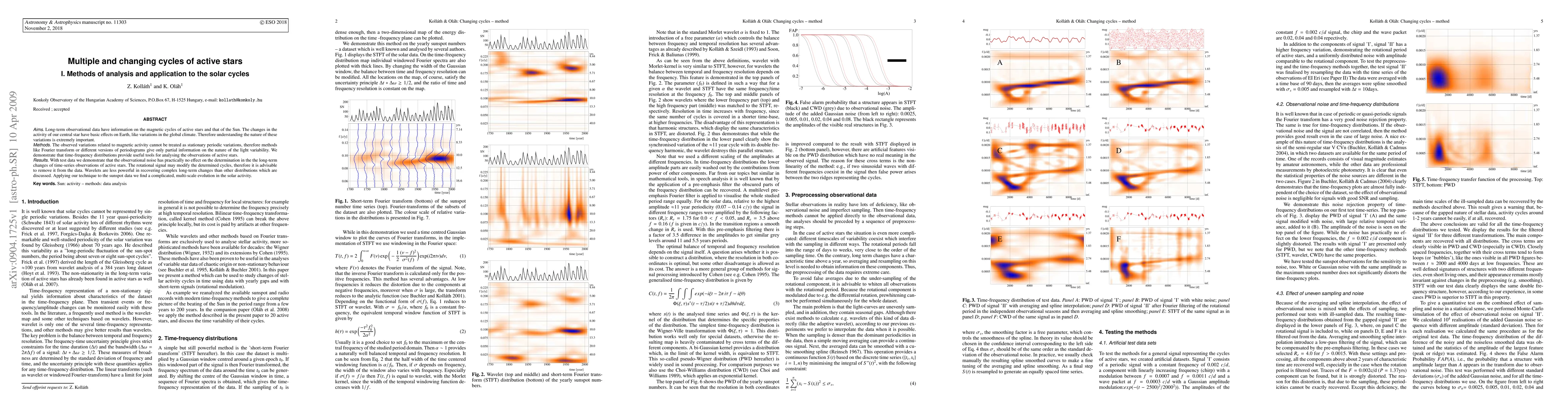 Long-term observational data have information on the magnetic cycles of active stars and that of the Sun. The changes in the activity of our central star have basic effects on Earth, like variations in the global climate. Therefore understanding the nature of these variations is extremely important. The observed variations related to magnetic activity cannot be treated as stationary periodic variations, therefore methods like Fourier transform or different versions of periodogramms give only partial information on the nature of the light variability. We demonstrate that time-frequency distributions provide useful tools for analyzing the observations of active stars. With test data we demonstrate that the observational noise has practically no effect on the determination in the the long-term changes of time-series observations of active stars. The rotational signal may modify the determined cycles, therefore it is advisable to remove it from the data. Wavelets are less powerful in recovering complex long-term changes than other distributions which are discussed. Applying our technique to the sunspot data we find a complicated, multi-scale evolution in the solar activity.