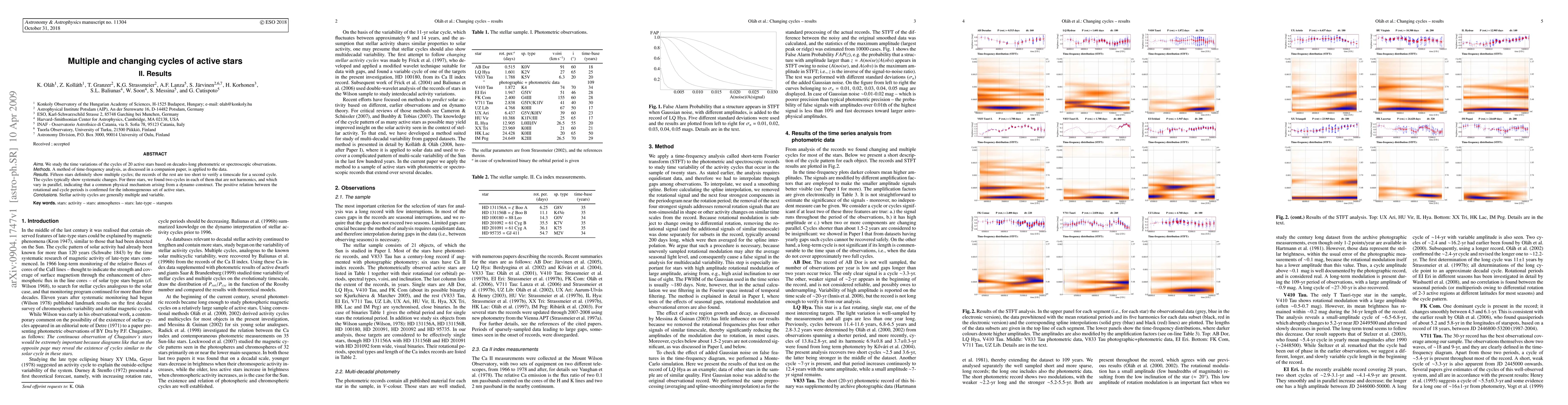 We study the time variations of the cycles of 20 active stars based on decades-long photometric or spectroscopic observations. A method of time-frequency analysis, as discussed in a companion paper, is applied to the data. Fifteen stars definitely show multiple cycles; the records of the rest are too short to verify a timescale for a second cycle. The cycles typically show systematic changes. For three stars, we found two cycles in each of them that are not harmonics, and which vary in parallel, indicating that a common physical mechanism arising from a dynamo construct. The positive relation between the rotational and cycle periods is confirmed for the inhomogeneous set of active stars. Stellar activity cycles are generally multiple and variable.