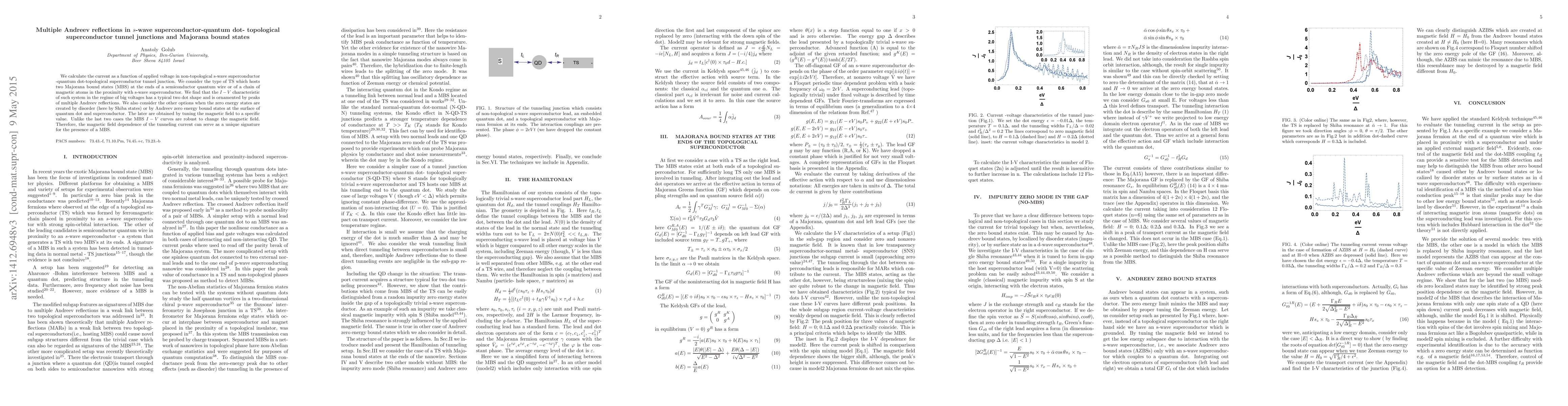 We calculate the current as a function of applied voltage in non-topological s-wave superconductor-quantum dot-topological superconductor tunnel junction. We consider the type of TS which hosts two Majorana bound states (MBS) at the ends of a semiconductor quantum wire or of a chain of magnetic atoms in the proximity with s-wave superconductor. We find that the $I-V$ characteristic of such system in the regime of big voltages has a typical two dot shape and is ornamented by peaks of multiple Andreev reflections. We also consider the other options when the zero energy states are created by disorder (here by Shiba states) or by Andreev zero energy bound states at the surface of quantum dot and superconductor. The later are obtained by tuning the magnetic field to a specific value. Unlike the last two cases the MBS $I-V$ curves are robust to change the magnetic field. Therefore, the magnetic field dependence of the tunneling current can serve as a unique signature for the presence of a MBS.