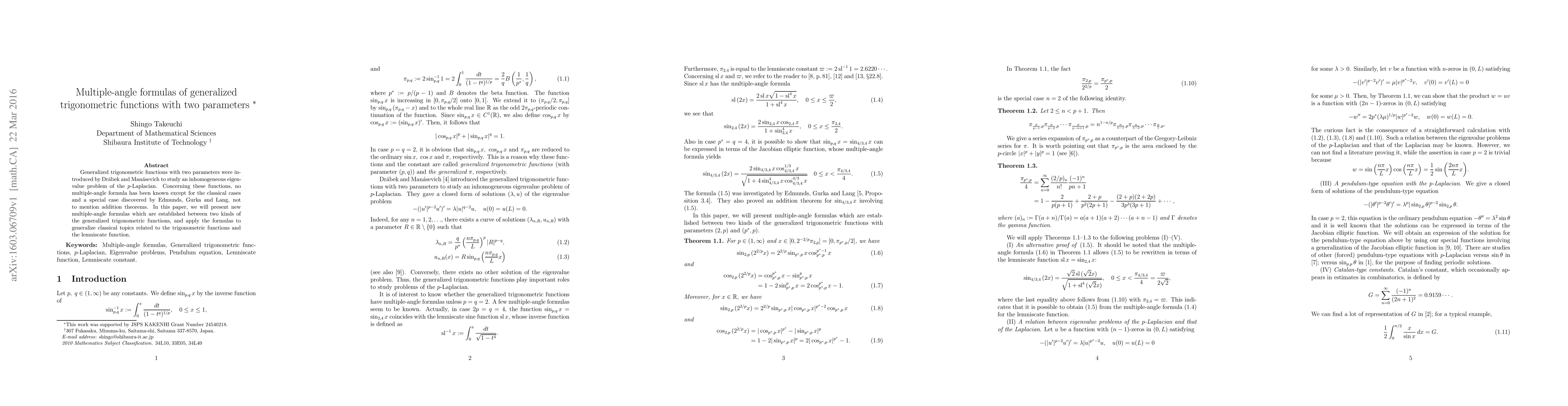 Generalized trigonometric functions with two parameters were introduced by Dr\'{a}bek and Man\'{a}sevich to study an inhomogeneous eigenvalue problem of the $p$-Laplacian. Concerning these functions, no multiple-angle formula has been known except for the classical cases and a special case discovered by Edmunds, Gurka and Lang, not to mention addition theorems. In this paper, we will present new multiple-angle formulas which are established between two kinds of the generalized trigonometric functions, and apply the formulas to generalize classical topics related to the trigonometric functions and the lemniscate function.