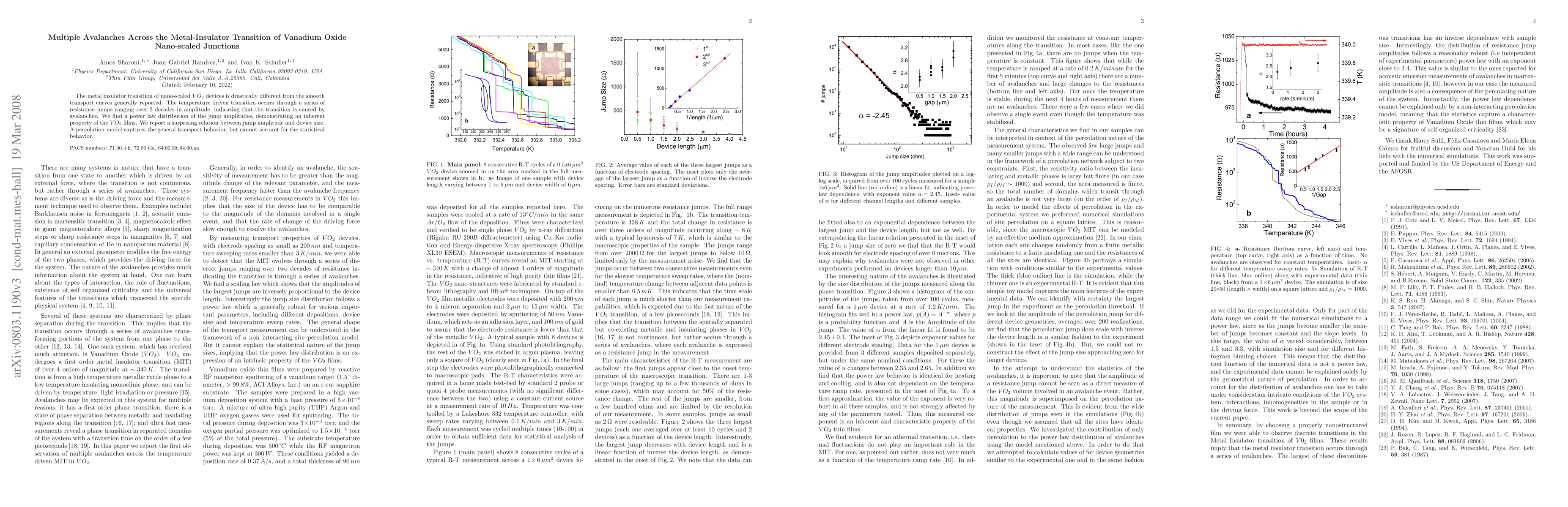 Research reveals that nano-scaled Vanadium Oxide devices exhibit sudden, drastic changes in resistance as they transition from metal to insulator at different temperatures, due to avalanches of resistance jumps. These jumps follow a power law distribution and are related to device size.
