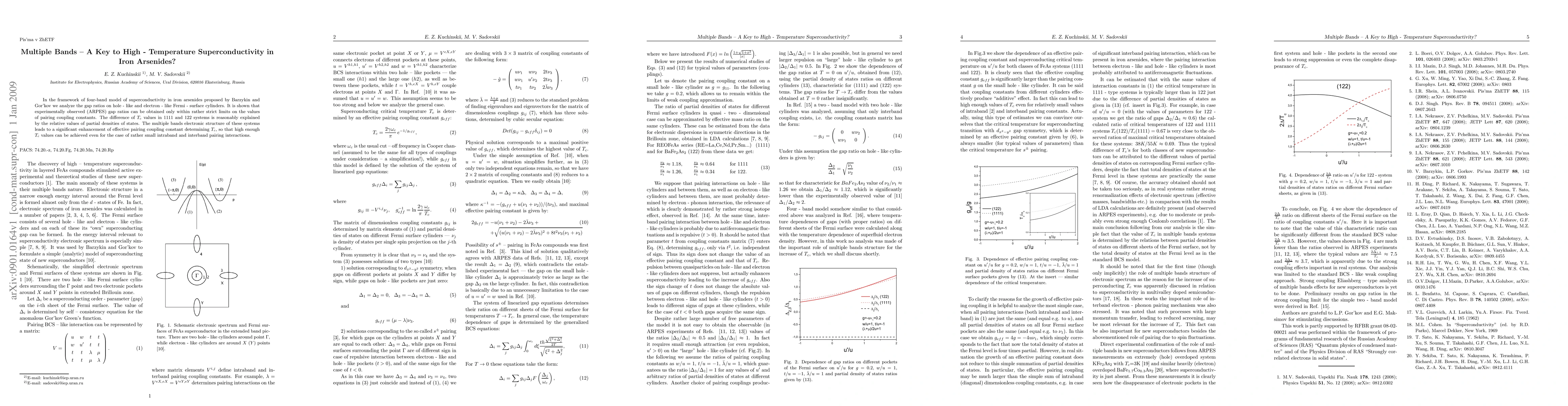 The paper presents a detailed analysis of the four-band model for iron arsenide superconductors, demonstrating how multiple bands contribute to high T_c values through enhanced effective pairing coupling constants.