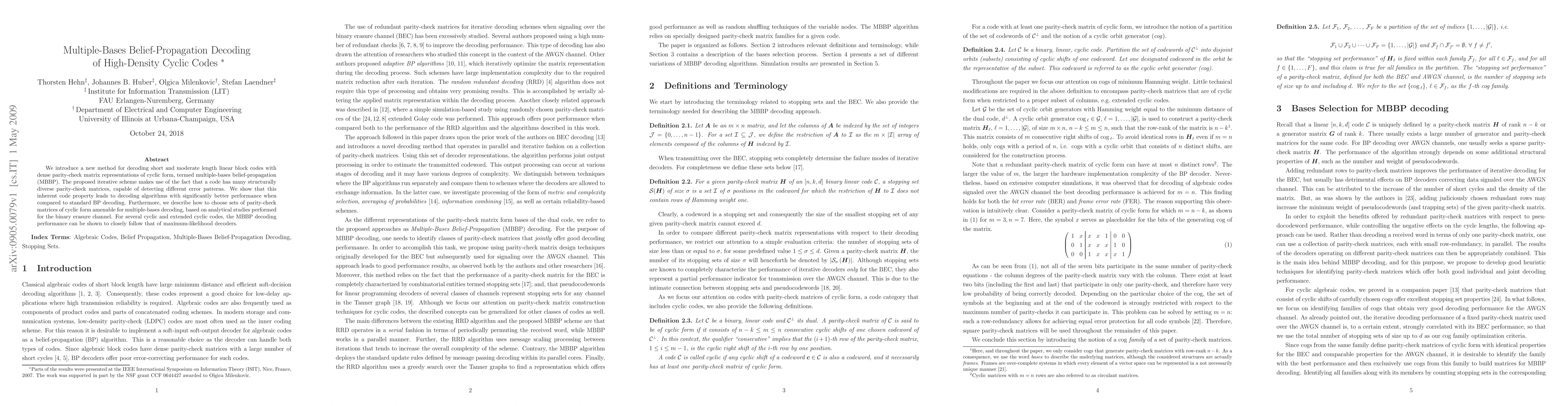 This paper proposes a multiple-bases belief-propagation (MBBP) decoding method for high-density cyclic codes, leveraging diverse parity-check matrices to detect different error patterns, resulting in significantly better performance than standard belief-propagation decoding. The method's effectiveness is demonstrated through analytical studies on the binary erasure channel.