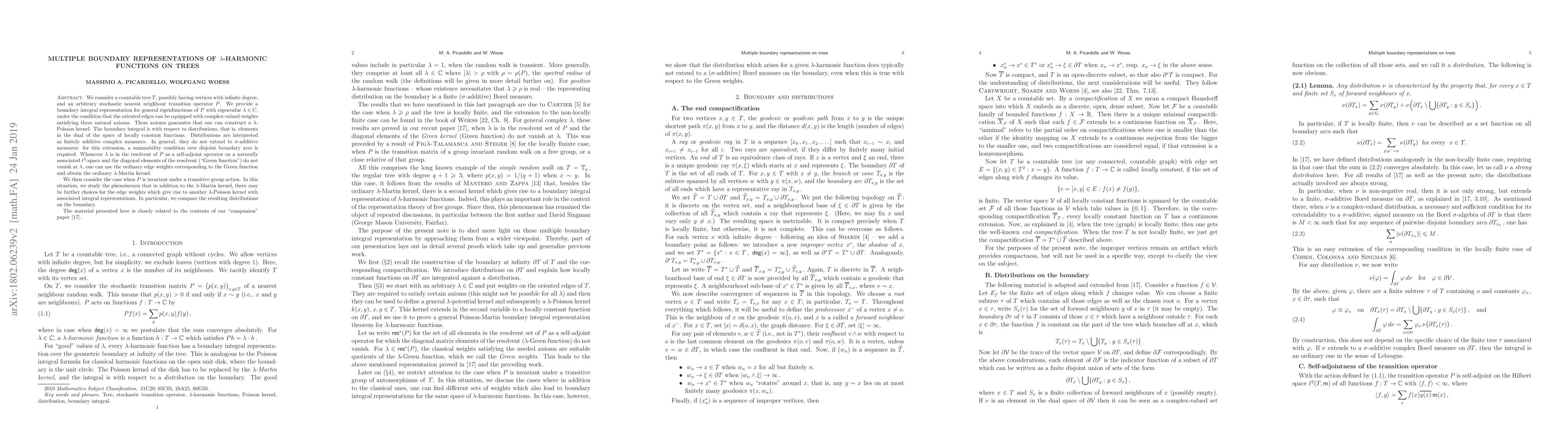 We consider a countable tree $T$, possibly having vertices with infinite degree, and an arbitrary stochastic nearest neighbour transition operator $P$. We provide a boundary integral representation for general eigenfunctions of $P$ with eigenvalue $\lambda \in \mathbb{C}$, under the condition that the oriented edges can be equipped with complex-valued weights satisfying three natural axioms. These axioms guarantee that one can construct a $\lambda$-Poisson kernel. The boundary integral is with respect to distributions, that is, elements in the dual of the space of locally constant functions. Distributions are interpreted as finitely additive complex measures. In general, they do not extend to $\sigma$-additive measures: for this extension, a summability condition over disjoint boundary arcs is required. Whenever $\lambda$ is in the resolvent of $P$ as a self-adjoint operator on a naturally associated $\ell^2$-space and the diagonal elements of the resolvent (`Green function') do not vanish at $\lambda$, one can use the ordinary edge weights corresponding to the Green function and obtain the ordinary $\lambda$-Martin kernel. We then consider the case when $P$ is invariant under a transitive group action. In this situation, we study the phenomenon that in addition to the $\lambda$-Martin kernel, there may be further choices for the edge weights which give rise to another $\lambda$-Poisson kernel with associated integral representations. In particular, we compare the resulting distributions on the boundary. The material presented here is closely related to the contents of our `companion' paper arXiv:1802.01976