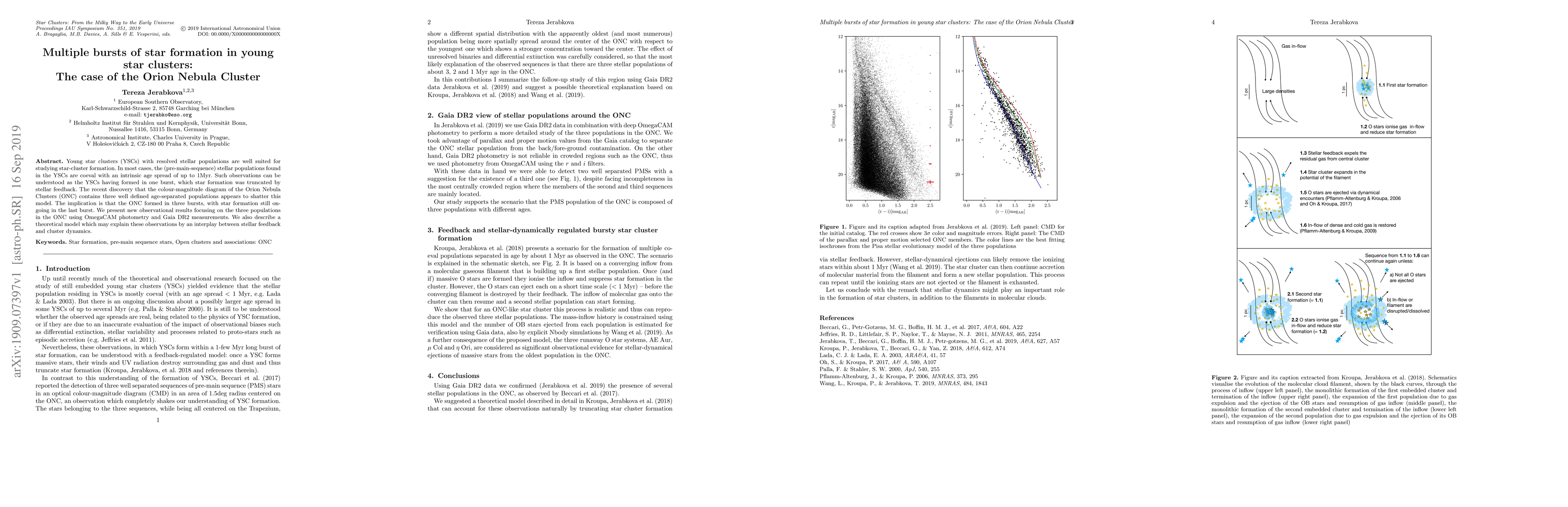 Young star clusters (YSCs) with resolved stellar populations are well suited for studying star-cluster formation. In most cases, the (pre-main-sequence) stellar populations found in the YSCs are coeval with an intrinsic age spread of up to 1Myr. Such observations can be understood as the YSCs having formed in one burst, which star formation was truncated by stellar feedback. The recent discovery that the colour-magnitude diagram of the Orion Nebula Clusters (ONC) contains three well defined age-separated populations appears to shatter this model. The implication is that the ONC formed in three bursts, with star formation still on-going in the last burst. We present new observational results focusing on the three populations in the ONC using OmegaCAM photometry and Gaia DR2 measurements. We also describe a theoretical model which may explain these observations by an interplay between stellar feedback and cluster dynamics.