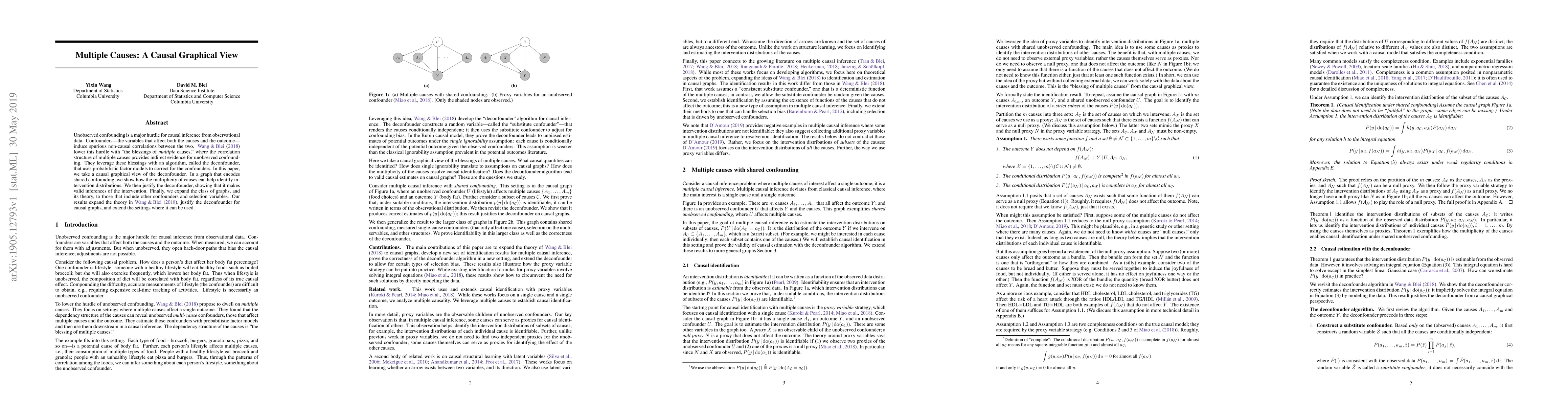 Unobserved confounding is a major hurdle for causal inference from observational data. Confounders---the variables that affect both the causes and the outcome---induce spurious non-causal correlations between the two. Wang & Blei (2018) lower this hurdle with "the blessings of multiple causes," where the correlation structure of multiple causes provides indirect evidence for unobserved confounding. They leverage these blessings with an algorithm, called the deconfounder, that uses probabilistic factor models to correct for the confounders. In this paper, we take a causal graphical view of the deconfounder. In a graph that encodes shared confounding, we show how the multiplicity of causes can help identify intervention distributions. We then justify the deconfounder, showing that it makes valid inferences of the intervention. Finally, we expand the class of graphs, and its theory, to those that include other confounders and selection variables. Our results expand the theory in Wang & Blei (2018), justify the deconfounder for causal graphs, and extend the settings where it can be used.