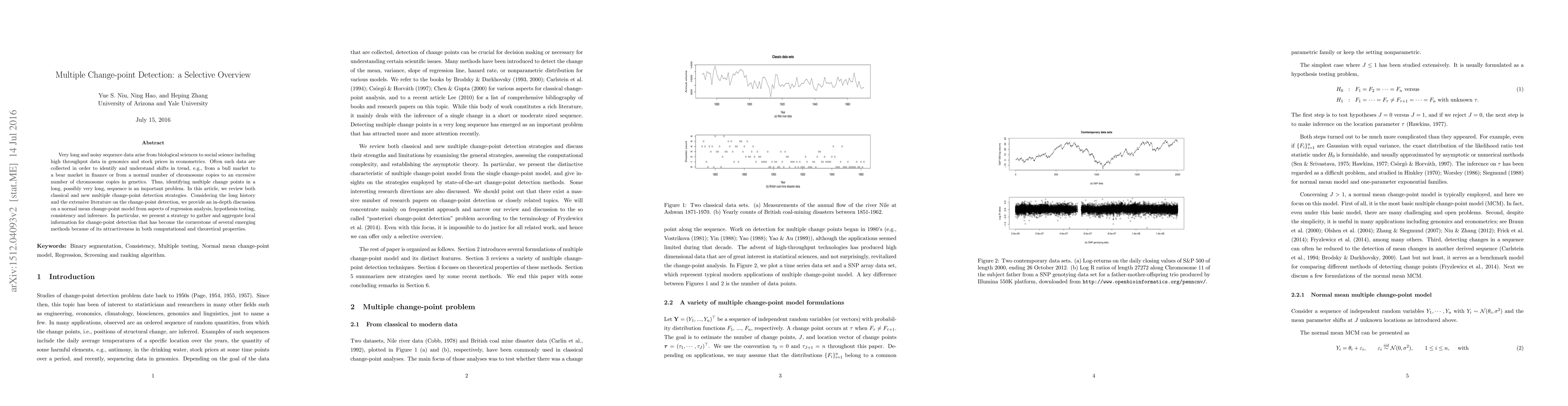 Very long and noisy sequence data arise from biological sciences to social science including high throughput data in genomics and stock prices in econometrics. Often such data are collected in order to identify and understand shifts in trend, e.g., from a bull market to a bear market in finance or from a normal number of chromosome copies to an excessive number of chromosome copies in genetics. Thus, identifying multiple change points in a long, possibly very long, sequence is an important problem. In this article, we review both classical and new multiple change-point detection strategies. Considering the long history and the extensive literature on the change-point detection, we provide an in-depth discussion on a normal mean change-point model from aspects of regression analysis, hypothesis testing, consistency and inference. In particular, we present a strategy to gather and aggregate local information for change-point detection that has become the cornerstone of several emerging methods because of its attractiveness in both computational and theoretical properties.
