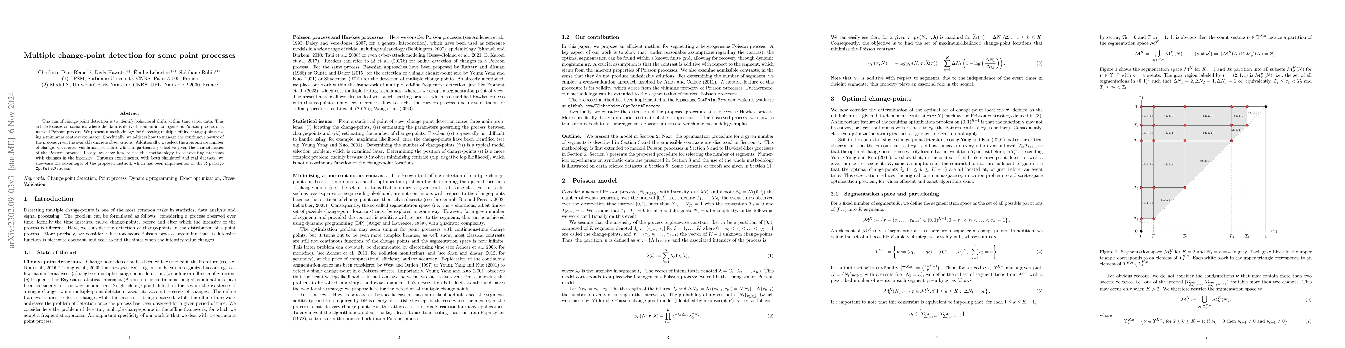 This paper proposes a methodology for detecting multiple change-points in inhomogeneous or marked Poisson processes using a minimum contrast estimator. The method employs cross-validation to determine the optimal number of change-points and is demonstrated to be effective through experiments on both simulated and real data sets, implemented in the R package \texttt{CptPointProcess}.