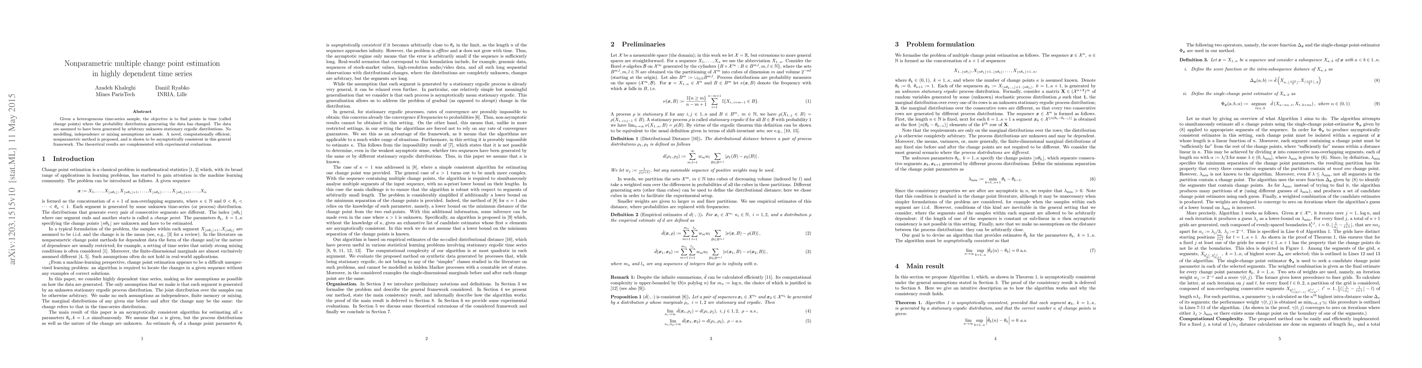 Given a heterogeneous time-series sample, the objective is to find points in time (called change points) where the probability distribution generating the data has changed. The data are assumed to have been generated by arbitrary unknown stationary ergodic distributions. No modelling, independence or mixing assumptions are made. A novel, computationally efficient, nonparametric method is proposed, and is shown to be asymptotically consistent in this general framework. The theoretical results are complemented with experimental evaluations.