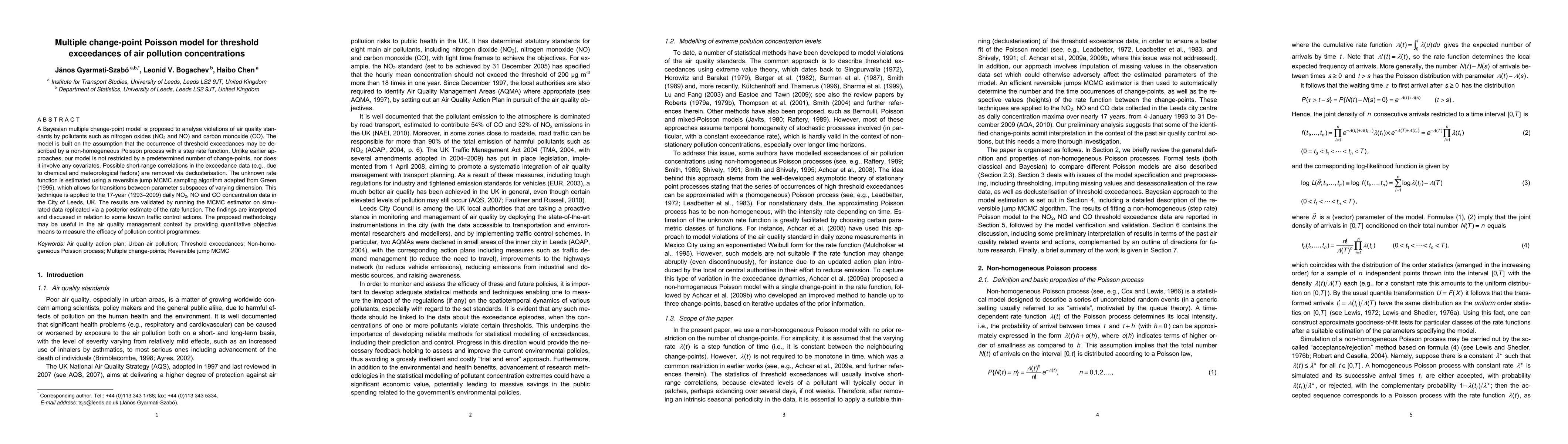 A Bayesian multiple change-point model is proposed to analyse violations of air quality standards by pollutants such as nitrogen oxides (NO2 and NO) and carbon monoxide (CO). The model is built on the assumption that the occurrence of threshold exceedances may be described by a non-homogeneous Poisson process with a step rate function. Unlike earlier approaches, our model is not restricted by a predetermined number of change-points, nor does it involve any covariates. Possible short-range correlations in the exceedance data (e.g., due to chemical and meteorological factors) are removed via declusterisation. The unknown rate function is estimated using a reversible jump MCMC sampling algorithm adapted from Green (1995), which allows for transitions between parameter subspaces of varying dimension. This technique is applied to the 17-year (1993-2009) daily NO2, NO and CO concentration data in the City of Leeds, UK. The results are validated by running the MCMC estimator on simulated data replicated via a posterior estimate of the rate function. The findings are interpreted and discussed in relation to some known traffic control actions. The proposed methodology may be useful in the air quality management context by providing quantitative objective means to measure the efficacy of pollution control programmes.