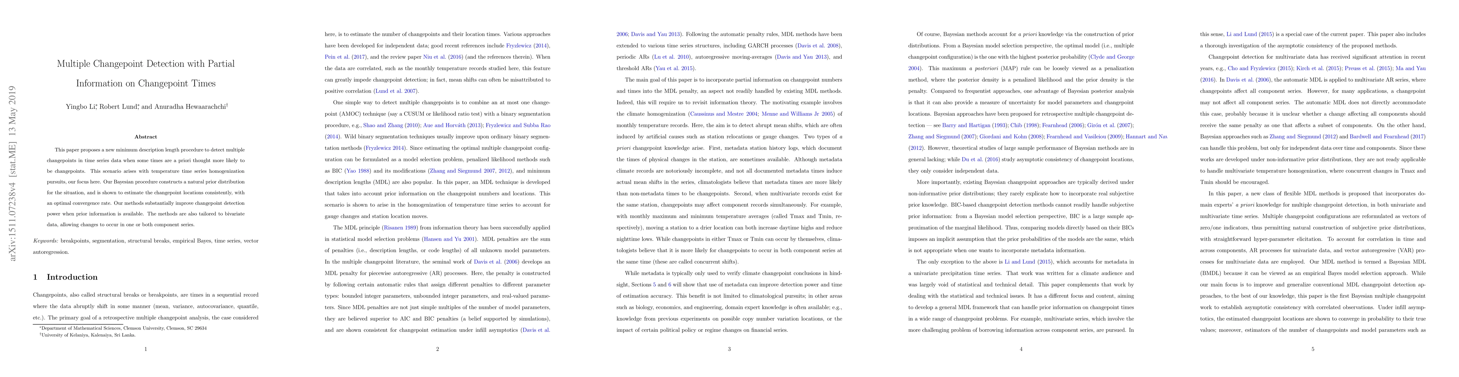 This paper introduces a Bayesian minimum description length procedure for detecting multiple changepoints in time series data, leveraging prior knowledge about likely changepoint times. The method is shown to consistently estimate changepoint locations with optimal convergence and significantly enhances detection power when prior information is available, particularly useful in temperature time series homogenization.