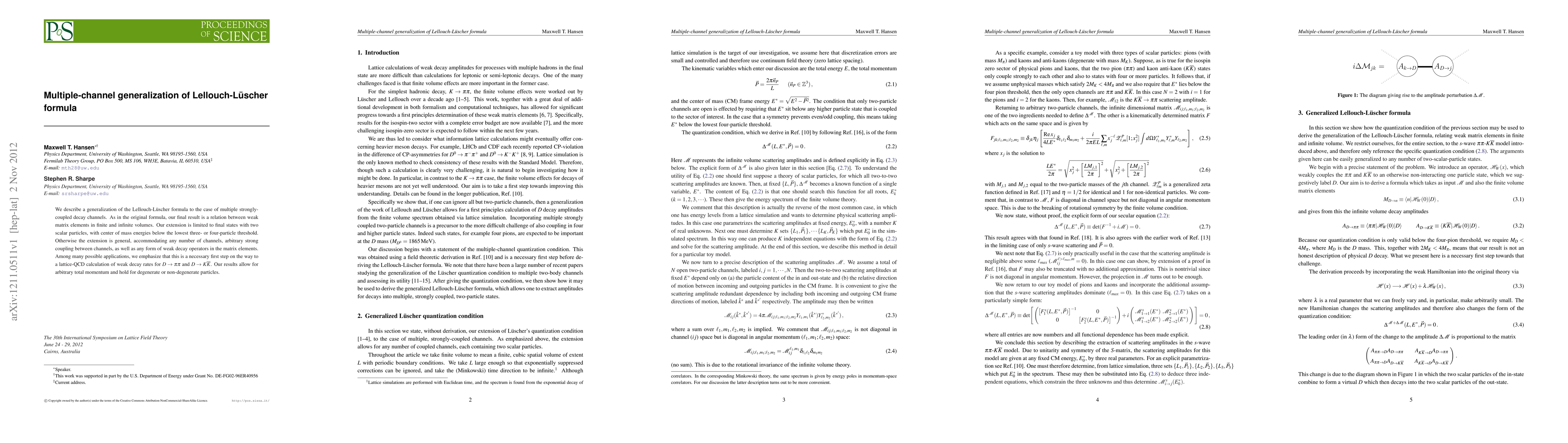 We describe a generalization of the Lellouch-L\"uscher formula to the case of multiple strongly-coupled decay channels. As in the original formula, our final result is a relation between weak matrix elements in finite and infinite volumes. Our extension is limited to final states with two scalar particles, with center of mass energies below the lowest three- or four-particle threshold. Otherwise the extension is general, accommodating any number of channels, arbitrary strong coupling between channels, as well as any form of weak decay operators in the matrix elements. Among many possible applications, we emphasize that this is a necessary first step on the way to a lattice-QCD calculation of weak decay rates for D -> pi pi and D -> K K-bar. Our results allow for arbitrary total momentum and hold for degenerate or non-degenerate particles.