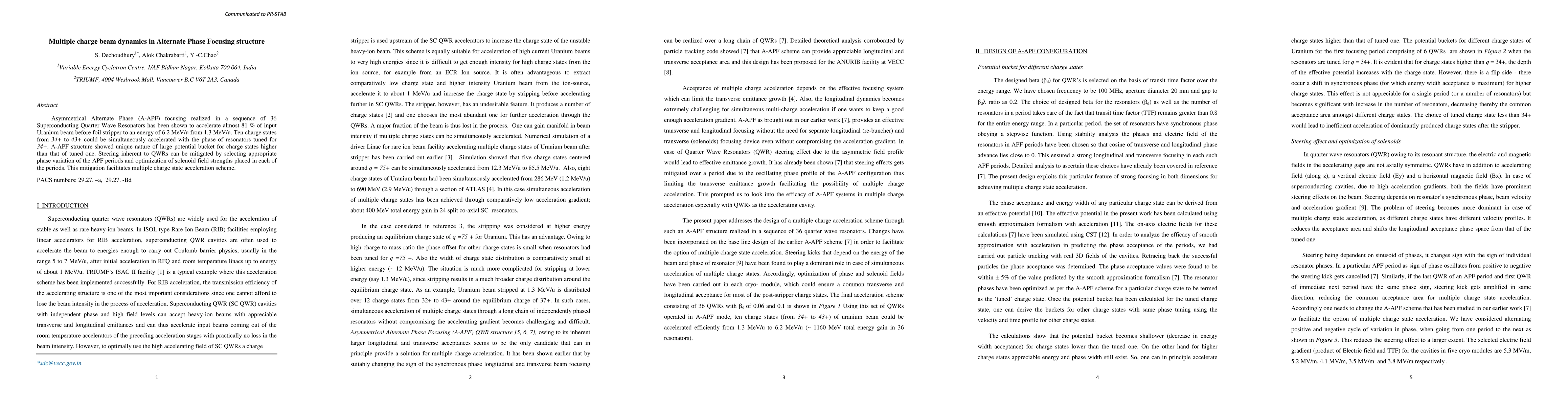 Asymmetrical Alternate Phase (A-APF) focusing realized in a sequence of 36 Superconducting Quarter Wave Resonators has been shown to accelerate almost 81 % of input Uranium beam before foil stripper to an energy of 6.2 MeV/u from 1.3 MeV/u. Ten charge states from 34+ to 43+ could be simultaneously accelerated with the phase of resonators tuned for 34+. A-APF structure showed unique nature of large potential bucket for charge states higher than that of tuned one. Steering inherent to QWRs can be mitigated by selecting appropriate phase variation of the APF periods and optimization of solenoid field strengths placed in each of the periods. This mitigation facilitates multiple charge state acceleration scheme
