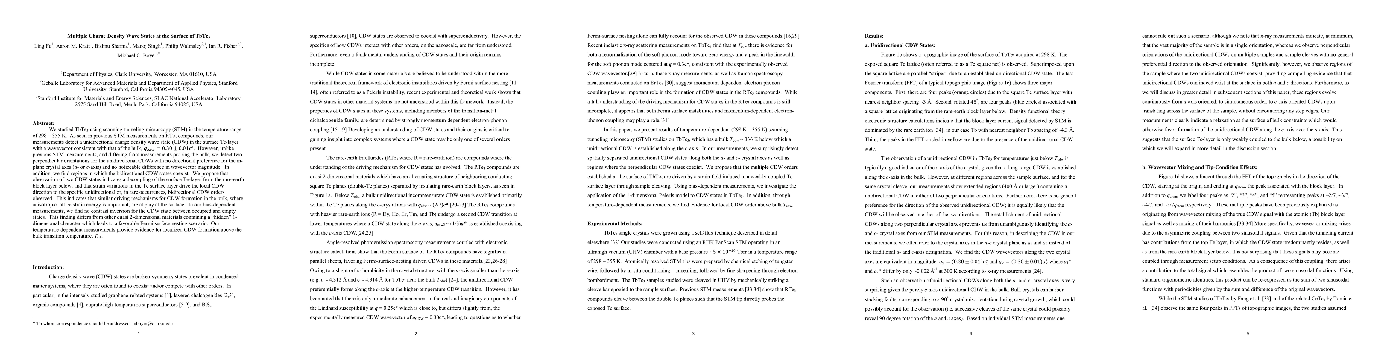 We studied TbTe$_{3}$ using scanning tunneling microscopy (STM) in the temperature range of 298 - 355 K. As seen in previous STM measurements on RTe$_{3}$ compounds, our measurements detect a unidirectional charge density wave state (CDW) in the surface Te-layer with a wavevector consistent with that of the bulk, q$_{cdw}$ = 0.30 $\pm$ 0.01c$^{*}$. However, unlike previous STM measurements, and differing from measurements probing the bulk, we detect two perpendicular orientations for the unidirectional CDWs with no directional preference for the in-plane crystal axes (a- or c-axis) and no noticeable difference in wavevector magnitude. In addition, we find regions in which the bidirectional CDW states coexist. We propose that observation of two CDW states indicates a decoupling of the surface Te-layer from the rare-earth block layer below, and that strain variations in the Te surface layer drive the local CDW direction to the specific unidirectional or, in rare occurrences, bidirectional CDW orders observed. This indicates that similar driving mechanisms for CDW formation in the bulk, where anisotropic lattice strain energy is important, are at play at the surface. In our bias-dependent measurements, we find no contrast inversion for the CDW state between occupied and empty states. This finding differs from other quasi 2-dimensional materials containing a hidden 1-dimensional character which leads to a favorable Fermi surface nesting scenario. Our temperature-dependent measurements provide evidence for localized CDW formation above the bulk transition temperature, T$_{cdw}$.