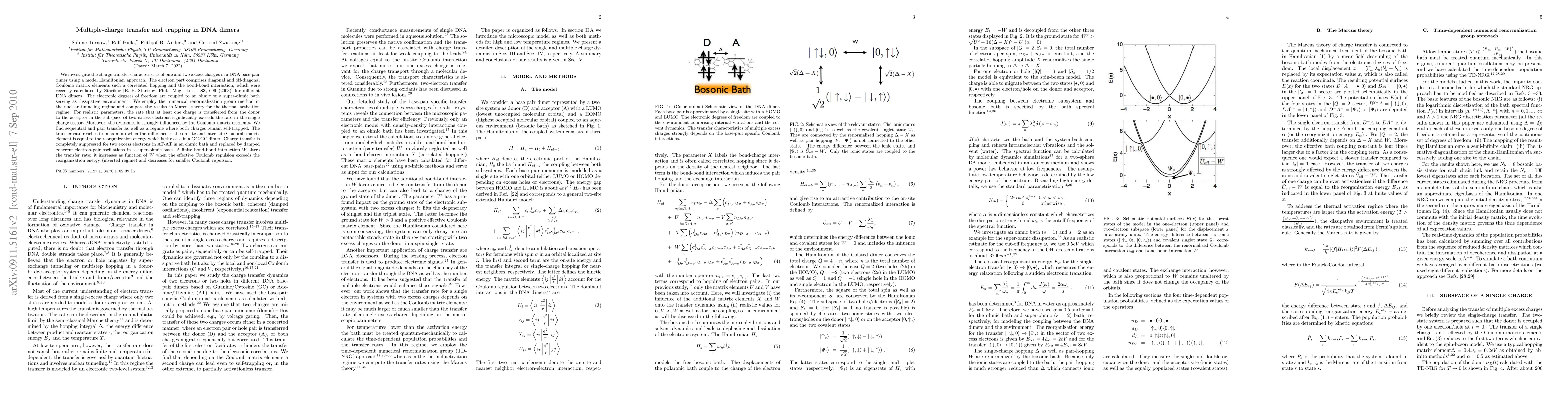 This paper investigates the charge transfer dynamics in DNA base-pair dimers with one and two excess charges, employing a model Hamiltonian and numerical renormalization group method. It finds that the transfer rate for two charges significantly exceeds that for one charge, with dynamics influenced by Coulomb matrix elements, showing sequential and pair transfer, and self-trapping regimes.
