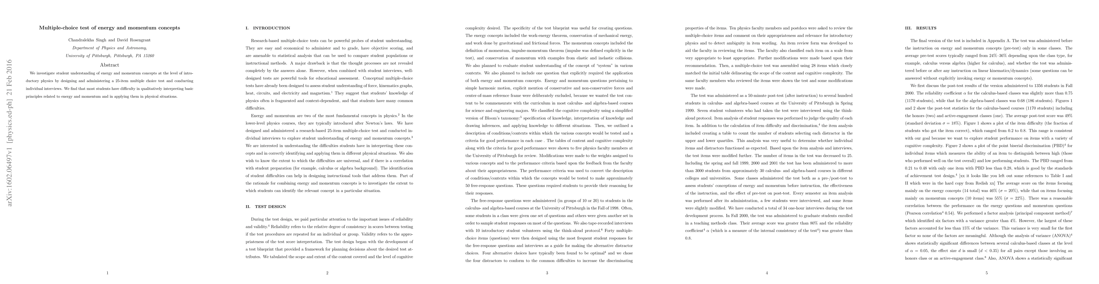 We investigate student understanding of energy and momentum concepts at the level of introductory physics by designing and administering a 25-item multiple choice test and conducting individual interviews. We find that most students have difficulty in qualitatively interpreting basic principles related to energy and momentum and in applying them in physical situations.