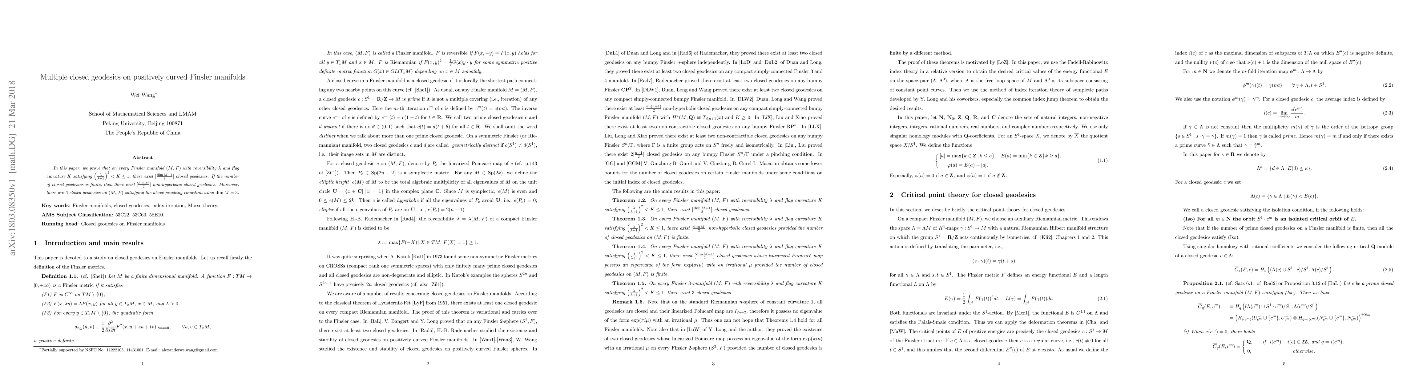 This paper demonstrates that on reversible Finsler manifolds with specific curvature bounds, there are at least $[\frac{\dim M+1}{2}]$ closed geodesics, with $[\frac{\dim M}{2}]$ being non-hyperbolic if the total number is finite. For three-dimensional manifolds under these conditions, exactly three closed geodesics exist.