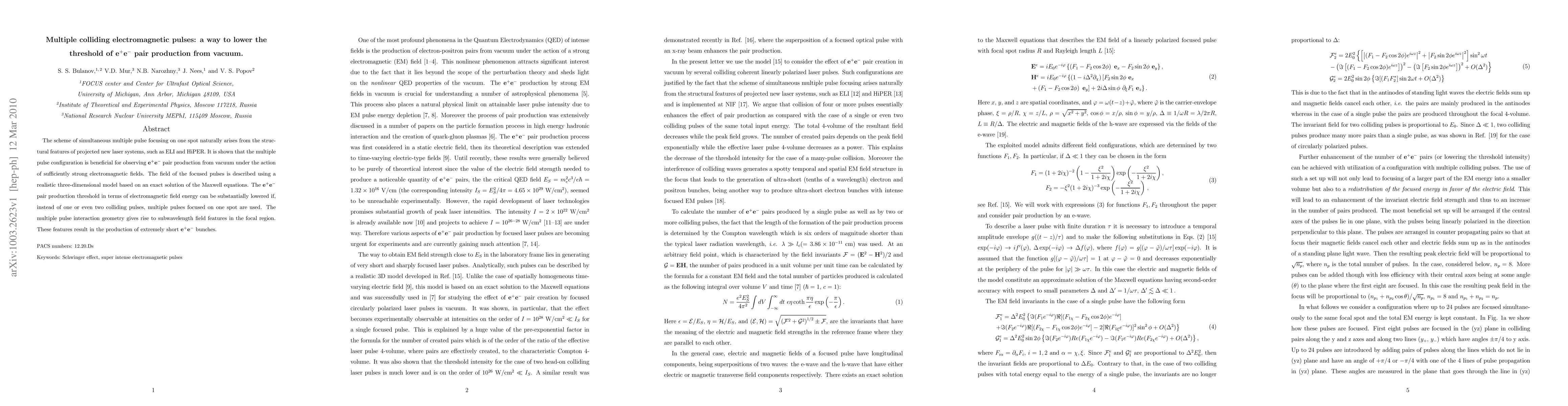 The scheme of simultaneous multiple pulse focusing on one spot naturally arises from the structural features of projected new laser systems, such as ELI and HiPER. It is shown that the multiple pulse configuration is beneficial for observing $e^+e^-$ pair production from vacuum under the action of sufficiently strong electromagnetic fields. The field of the focused pulses is described using a realistic three-dimensional model based on an exact solution of the Maxwell equations. The $e^+e^-$ pair production threshold in terms of electromagnetic field energy can be substantially lowered if, instead of one or even two colliding pulses, multiple pulses focused on one spot are used. The multiple pulse interaction geometry gives rise to subwavelength field features in the focal region. These features result in the production of extremely short $e^+e^-$ bunches.