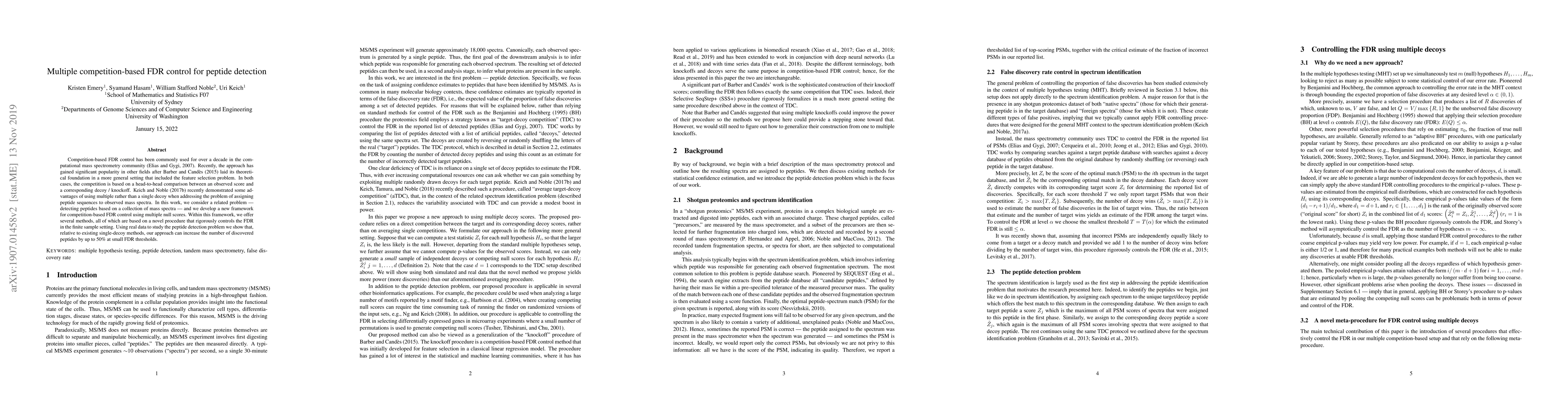 This paper introduces a new framework for competition-based FDR control using multiple decoys for peptide detection in mass spectrometry. It demonstrates that this approach can discover up to 50% more peptides compared to single-decoy methods, while maintaining a controlled FDR.