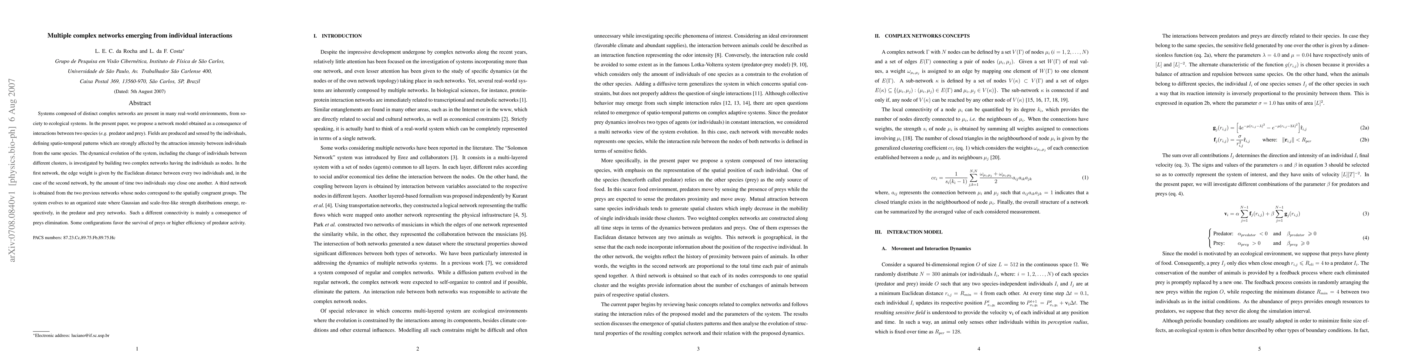 Systems composed of distinct complex networks are present in many real-world environments, from society to ecological systems. In the present paper, we propose a network model obtained as a consequence of interactions between two species (e.g. predator and prey). Fields are produced and sensed by the individuals, defining spatio-temporal patterns which are strongly affected by the attraction intensity between individuals from the same species. The dynamical evolution of the system, including the change of individuals between different clusters, is investigated by building two complex networks having the individuals as nodes. In the first network, the edge weight is given by the Euclidean distance between every two individuals and, in the case of the second network, by the amount of time two individuals stay close one another. A third network is obtained from the two previous networks whose nodes correspond to the spatially congruent groups. The system evolves to an organized state where Gaussian and scale-free-like strength distributions emerge, respectively, in the predator and prey networks. Such a different connectivity is mainly a consequence of preys elimination. Some configurations favor the survival of preys or higher efficiency of predator activity.