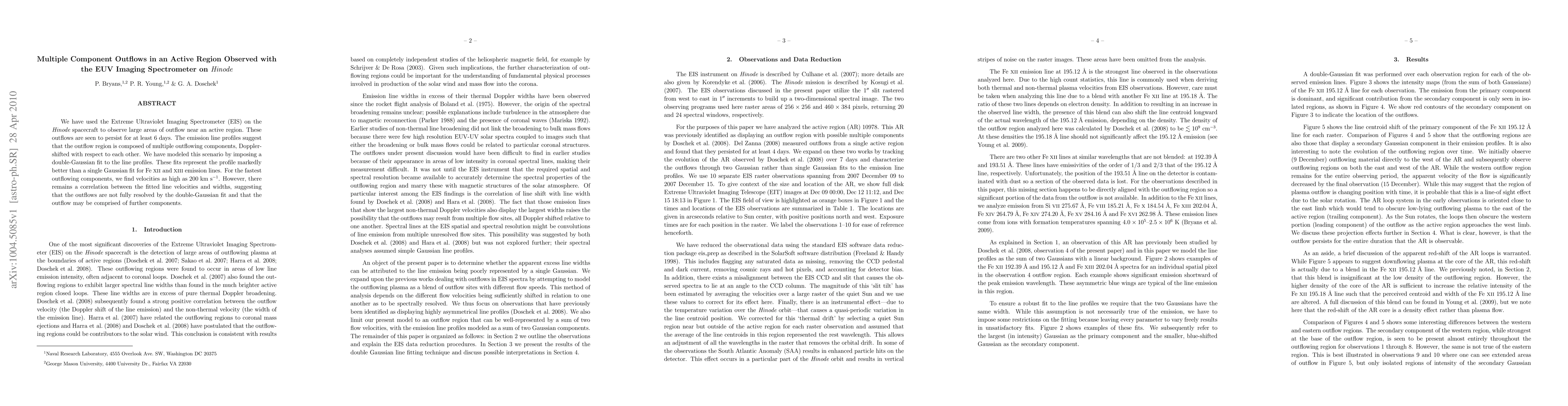 This paper uses the Hinode spacecraft's EUV Imaging Spectrometer to observe persistent outflows in an active region, finding multiple Doppler-shifted components. A double-Gaussian model fits the emission line profiles better than a single Gaussian, revealing velocities up to 200 km/s, though the correlation between velocities and widths suggests further unresolved components.