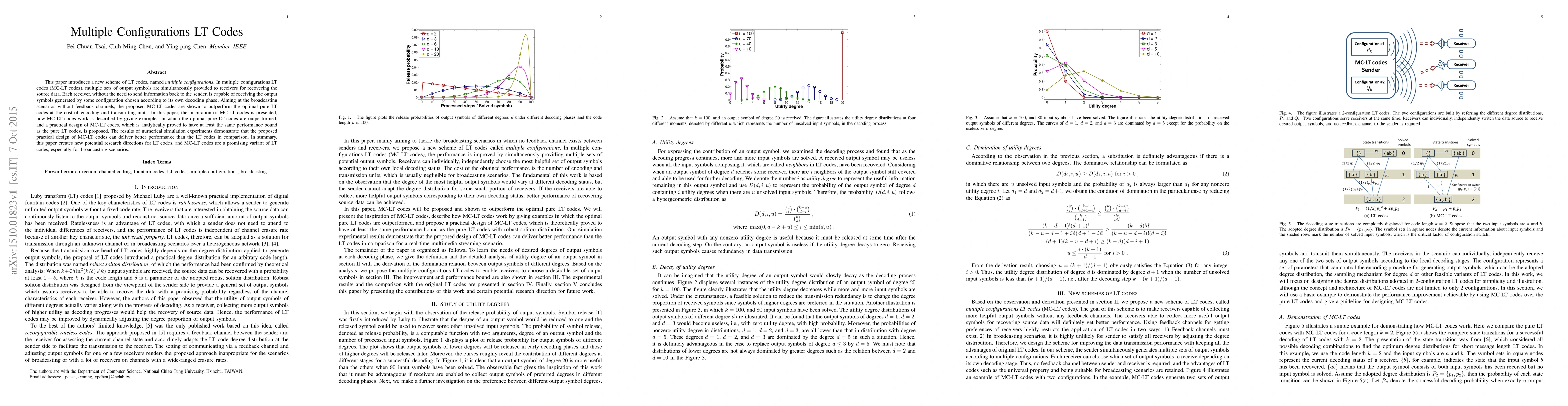This paper introduces a new scheme of LT codes, named multiple configurations. In multiple configurations LT codes (MC-LT codes), multiple sets of output symbols are simultaneously provided to receivers for recovering the source data. Each receiver, without the need to send information back to the sender, is capable of receiving the output symbols generated by some configuration chosen according to its own decoding phase. Aiming at the broadcasting scenarios without feedback channels, the proposed MC-LT codes are shown to outperform the optimal pure LT codes at the cost of encoding and transmitting units. In this paper, the inspiration of MC-LT codes is presented, how MC-LT codes work is described by giving examples, in which the optimal pure LT codes are outperformed, and a practical design of MC-LT codes, which is analytically proved to have at least the same performance bound as the pure LT codes, is proposed. The results of numerical simulation experiments demonstrate that the proposed practical design of MC-LT codes can deliver better performance than the LT codes in comparison. In summary, this paper creates new potential research directions for LT codes, and MC-LT codes are a promising variant of LT codes, especially for broadcasting scenarios.