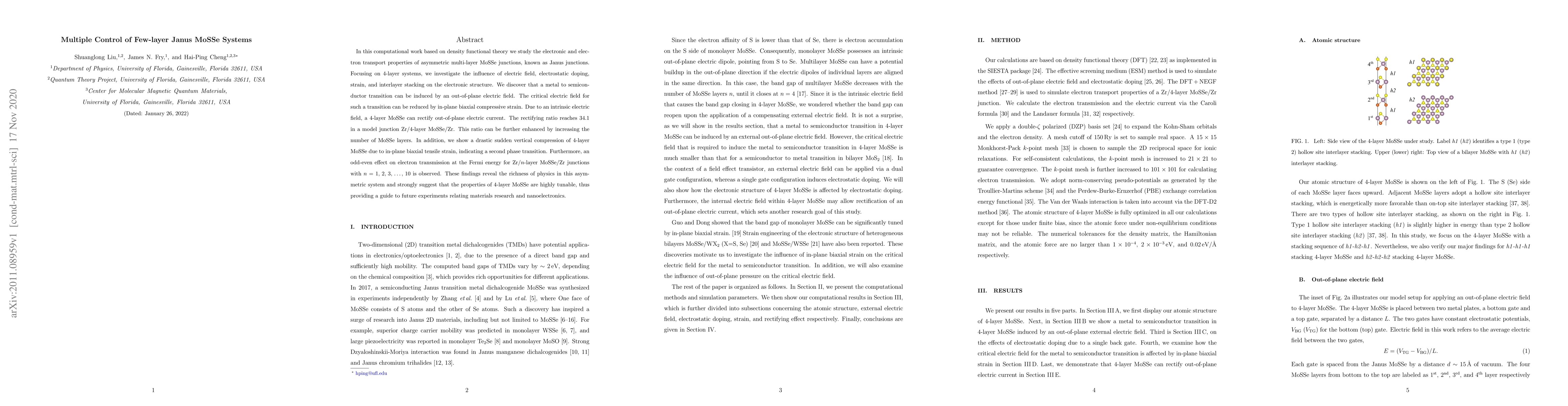 In this computational work based on density functional theory we study the electronic and electron transport properties of asymmetric multi-layer MoSSe junctions, known as Janus junctions. Focusing on 4-layer systems, we investigate the influence of electric field, electrostatic doping, strain, and interlayer stacking on the electronic structure. We discover that a metal to semiconductor transition can be induced by an out-of-plane electric field. The critical electric field for such a transition can be reduced by in-plane biaxial compressive strain. Due to an intrinsic electric field, a 4-layer MoSSe can rectify out-of-plane electric current. The rectifying ratio reaches 34.1 in a model junction Zr/4-layer MoSSe/Zr. This ratio can be further enhanced by increasing the number of MoSSe layers. In addition, we show a drastic sudden vertical compression of 4-layer MoSSe due to in-plane biaxial tensile strain, indicating a second phase transition. Furthermore, an odd-even effect on electron transmission at the Fermi energy for Zr/$n$-layer MoSSe/Zr junctions with $n=1, \, 2,\, 3, \,\dots,\, 10$ is observed. These findings reveal the richness of physics in this asymmetric system and strongly suggest that the properties of 4-layer MoSSe are highly tunable, thus providing a guide to future experiments relating materials research and nanoelectronics.