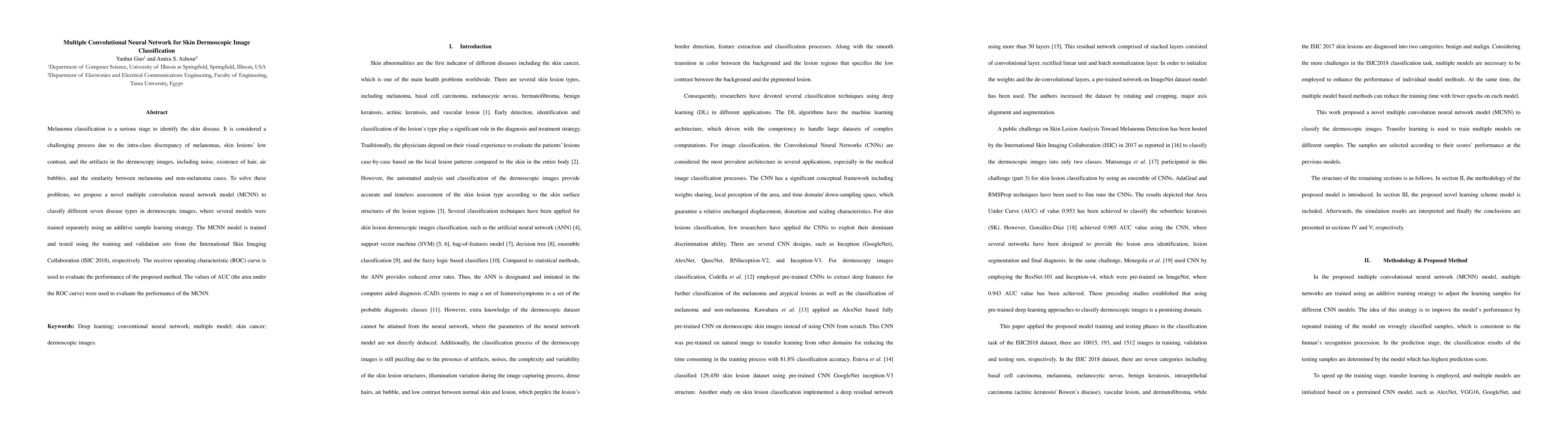 Melanoma classification is a serious stage to identify the skin disease. It is considered a challenging process due to the intra-class discrepancy of melanomas, skin lesions low contrast, and the artifacts in the dermoscopy images, including noise, existence of hair, air bubbles, and the similarity between melanoma and non-melanoma cases. To solve these problems, we propose a novel multiple convolution neural network model (MCNN) to classify different seven disease types in dermoscopic images, where several models were trained separately using an additive sample learning strategy. The MCNN model is trained and tested using the training and validation sets from the International Skin Imaging Collaboration (ISIC 2018), respectively. The receiver operating characteristic (ROC) curve is used to evaluate the performance of the proposed method. The values of AUC (the area under the ROC curve) were used to evaluate the performance of the MCNN.