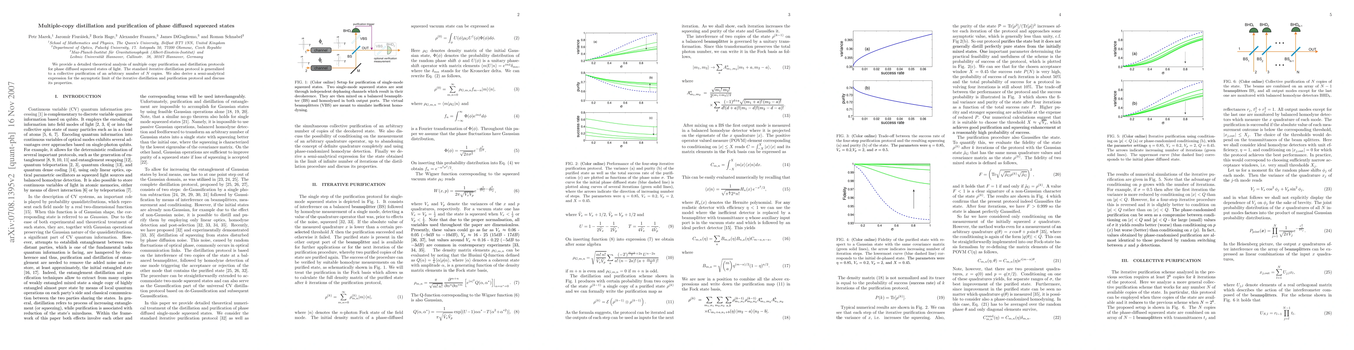 We provide a detailed theoretical analysis of multiple copy purification and distillation protocols for phase diffused squeezed states of light. The standard iterative distillation protocol is generalized to a collective purification of an arbitrary number of N copies. We also derive a semi-analytical expression for the asymptotic limit of the iterative distillation and purification protocol and discuss its properties.