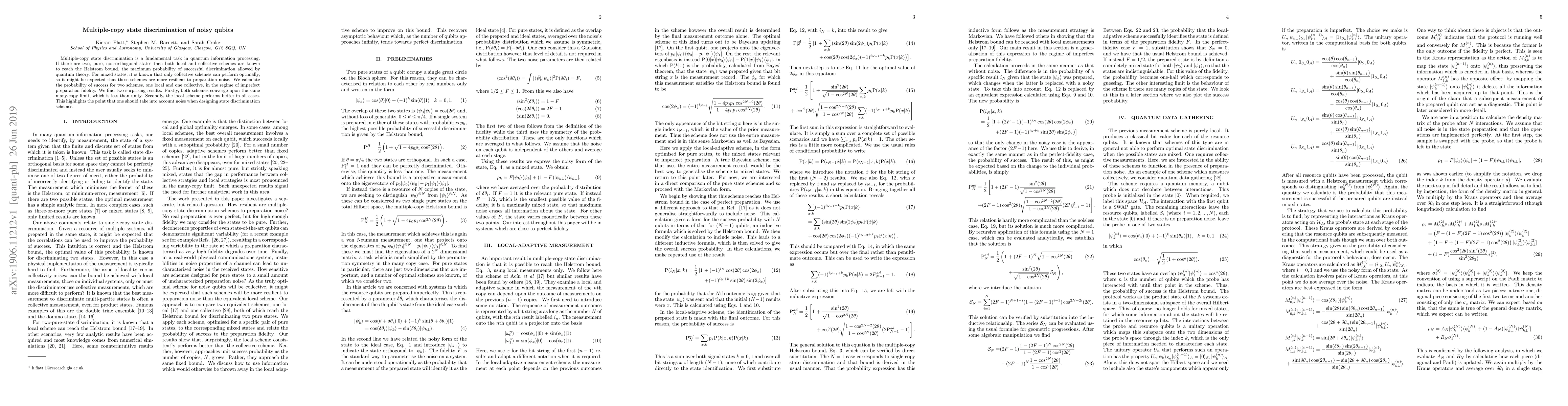 This paper investigates multiple-copy state discrimination for noisy qubits, comparing local and collective schemes. Surprisingly, both schemes converge to the same suboptimal limit, but the local scheme outperforms the collective scheme under imperfect preparation fidelity, emphasizing the importance of considering noise in scheme design.