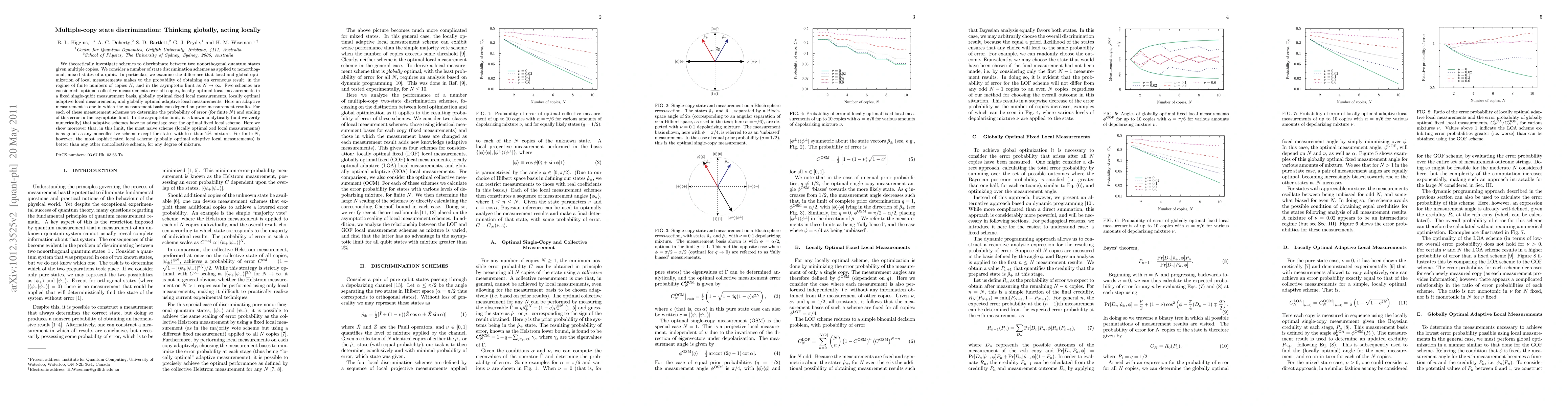 This paper investigates various schemes for discriminating between two nonorthogonal quantum states using multiple copies, focusing on the difference between local and global optimization. The study shows that adaptive schemes do not outperform fixed local schemes in the asymptotic limit, while the most sophisticated local scheme is superior for finite copies.