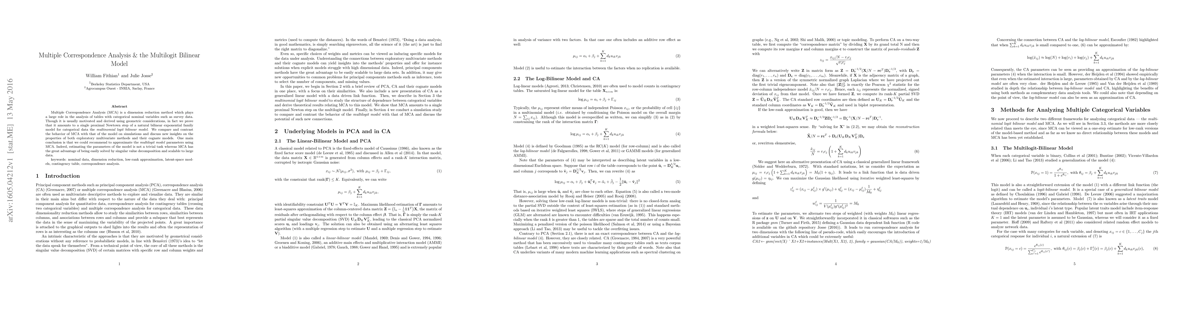 Multiple Correspondence Analysis (MCA) is equivalent to a single proximal Newton step of the multinomial logit bilinear model, making it a scalable method for approximating model parameters. MCA can be recommended as an alternative to estimating complex model parameters.