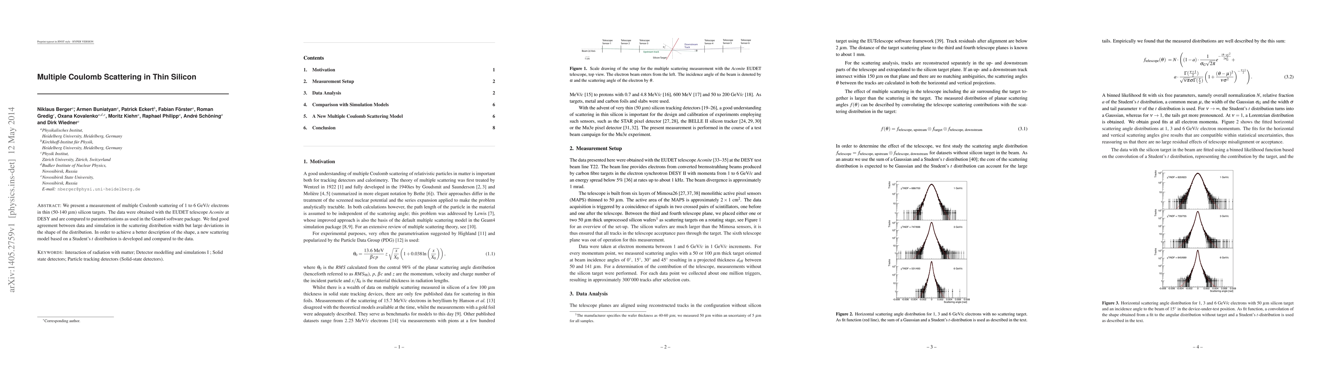 This study measures multiple Coulomb scattering of high-energy electrons in thin silicon targets, finding good agreement between experimental data and Geant4 simulations in scattering distribution width but significant deviations in shape. A new scattering model based on a Student's t distribution is proposed to better describe the observed distribution shape.