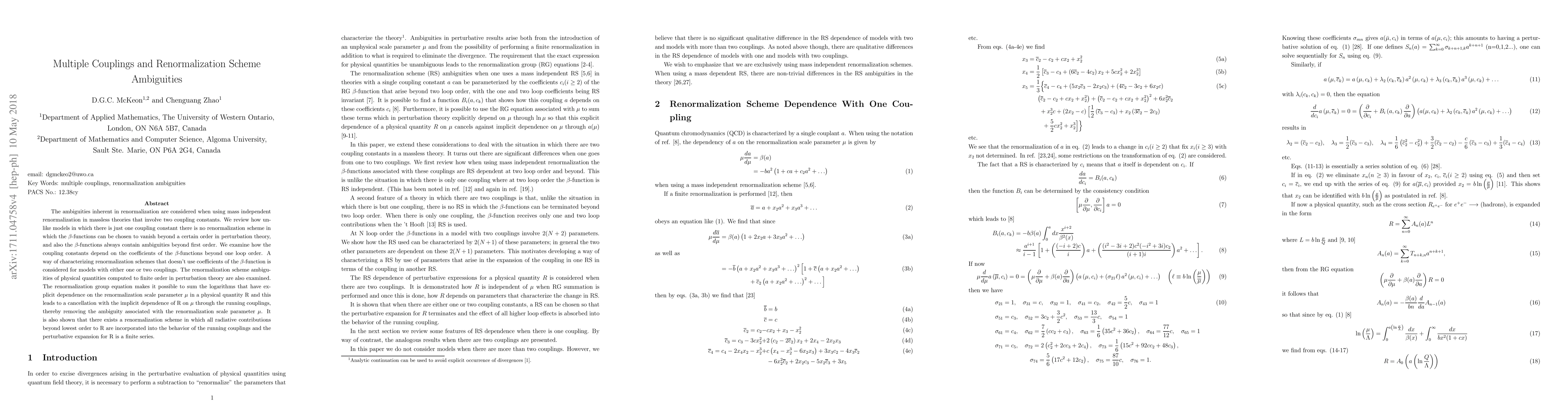 The ambiguities inherent in renormalization are considered when using mass-independent renormalization in massless theories that involve two coupling coupling constants. We review how there is no renormalization scheme in which the beta-functions can be chosen to vanish beyond a certain order in perturbation theory, but that the beta-functions always contain ambiguities beyond first order. We examine how the coupling constants depend on the coefficients of the beta-function beyond one loop order. A way of characterizing renormalization schemes that doesn't use coefficients of the beta-function is considered for models with either one or two couplings. The renormalization scheme ambiguities of physical quantities computed to finite order in perturbation theory are also examined. We demonstrate how summation of the logarithms that have explicit dependence on the renormalization scale parameter mu in a physical quantity R leads to a cancellation with the implicit dependence of R on mu through the running couplings. It is also shown that there exists a renormalization scheme in which all radiative effects beyond lowest order are incorporated into the behaviour of the running couplings.