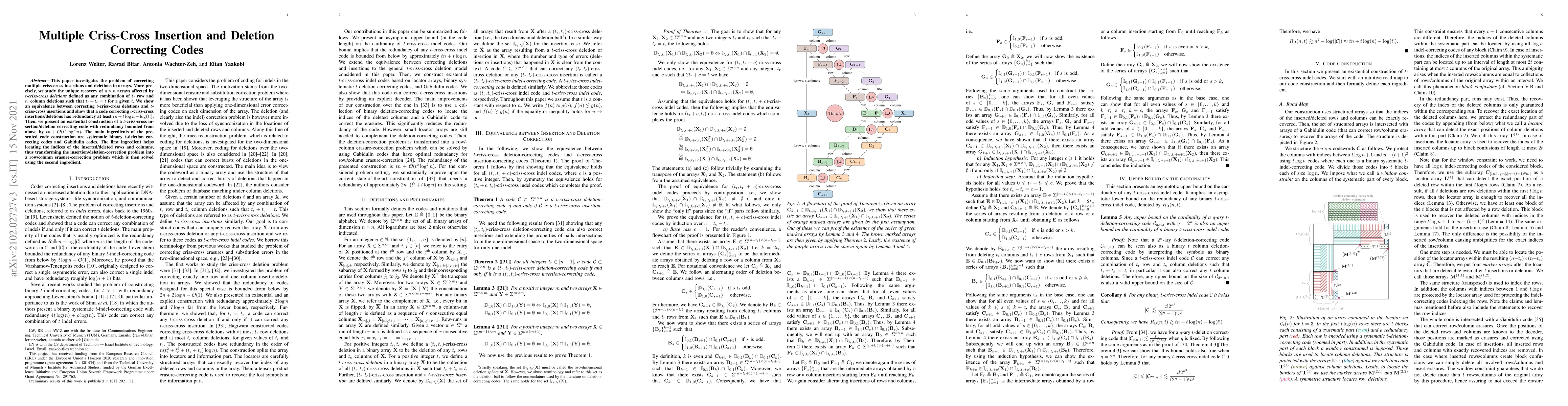 This paper develops a code for correcting multiple criss-cross insertions and deletions in arrays, showing an equivalence between the two and presenting a construction with redundancy bounded by $tn + \mathcal{O}(t^2 \log^2 n)$. The construction leverages systematic binary $t$-deletion correcting codes and Gabidulin codes to transform and solve the problem.