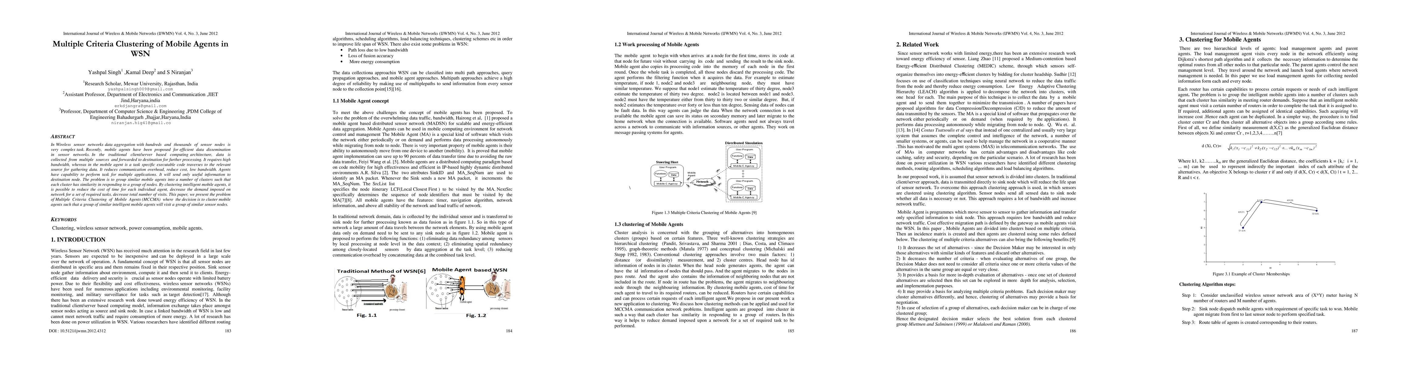 In Wireless sensor networks data aggregation with hundreds and thousands of sensor nodes is very complex task. Recently, mobile agents have been proposed for efficient data dissemination in sensor networks. In the traditional client/server based computing architecture, data is collected from multiple sources and forwarded to destination for further processing. It requires high bandwidth, whereas in the mobile agent is a task specific executable code traverses to the relevant source for gathering data. It reduces communication overhead, reduce cost, low bandwidth. Agents have capability to perform task for multiple applications. It will send only useful information to destination node. The problem is to group similar mobile agents into a number of clusters such that each cluster has similarity in responding to a group of nodes. By clustering intelligent mobile agents, it is possible to reduce the cost of time for each individual agent, decrease the demand imposed on network for a set of required tasks, decrease total number of visits. This paper, we present the problem of Multiple Criteria Clustering of Mobile Agents (MCCMA) where the decision is to cluster mobile agents such that a group of similar intelligent mobile agents will visit a group of similar sensor nodes.