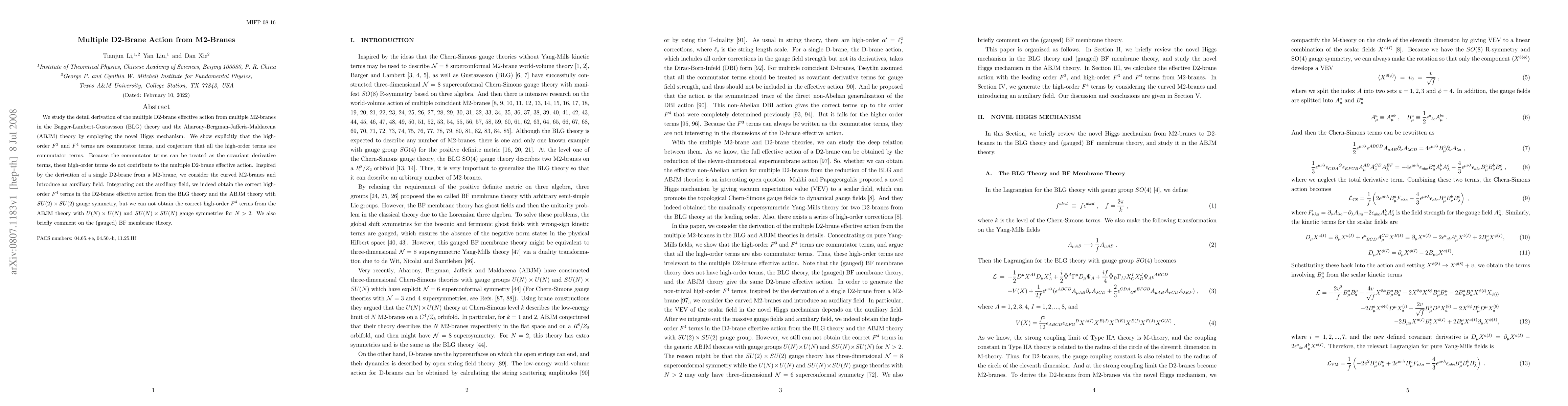 This paper derives the multiple D2-brane effective action from multiple M2-branes using a novel Higgs mechanism, showing that high-order commutator terms do not contribute. It successfully obtains high-order F^4 terms for BLG theory but not for ABJM theory with certain gauge symmetries, and briefly discusses gauged BF membrane theory.