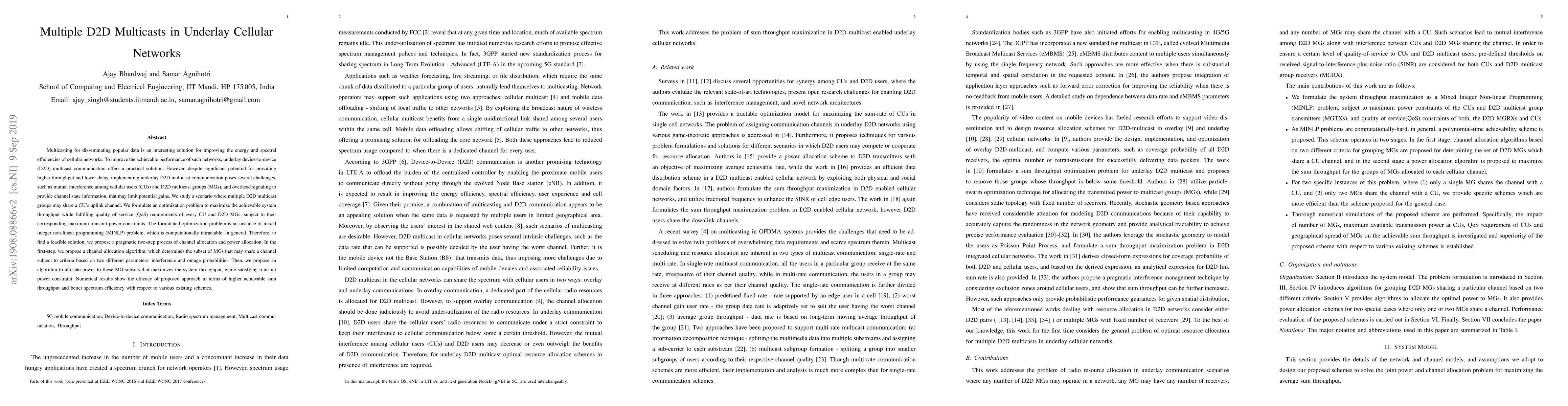 This paper investigates underlay D2D multicast communication to enhance cellular network efficiency, addressing challenges like interference and signaling overhead. It proposes an optimization framework to maximize system throughput while meeting QoS and power constraints, employing a two-step channel and power allocation process to achieve feasible solutions. Numerical results demonstrate improved throughput and spectrum efficiency compared to existing methods.