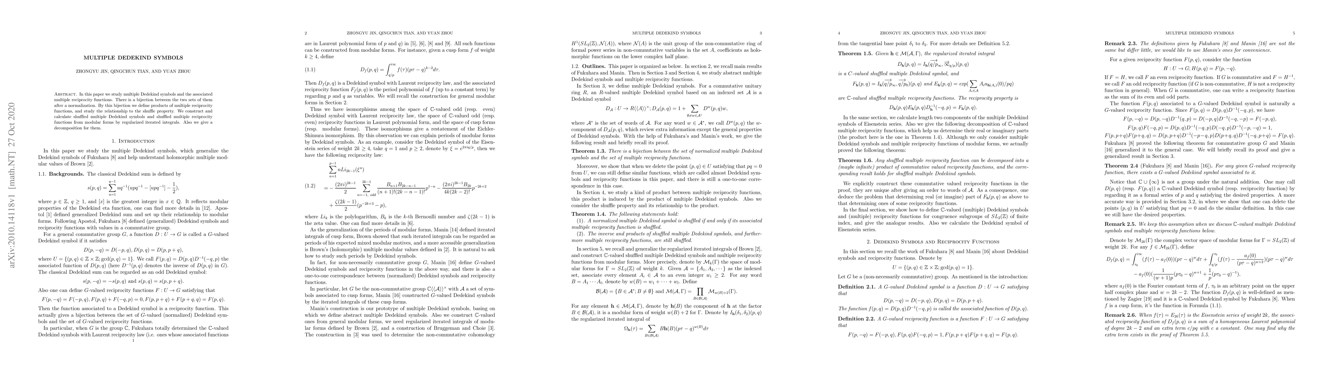 This paper investigates multiple Dedekind symbols and associated multiple reciprocity functions, establishing a normalized bijection between them. It introduces a product for multiple reciprocity functions and explores its connection to the shuffle property, constructing and decomposing shuffled multiple symbols and functions from modular forms.