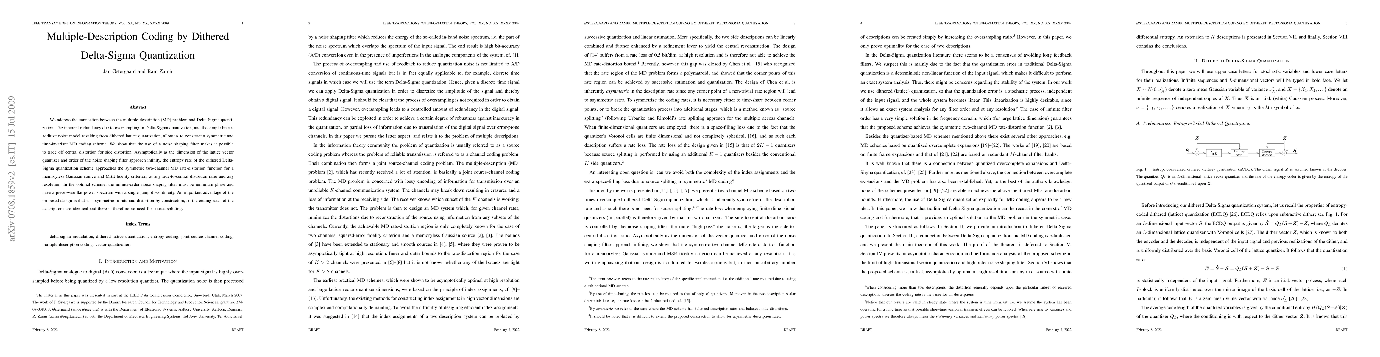 This paper presents a multiple-description coding scheme using dithered Delta-Sigma quantization, demonstrating how it achieves the symmetric two-channel MD rate-distortion function. The design is symmetric in rate and distortion, eliminating the need for source splitting.