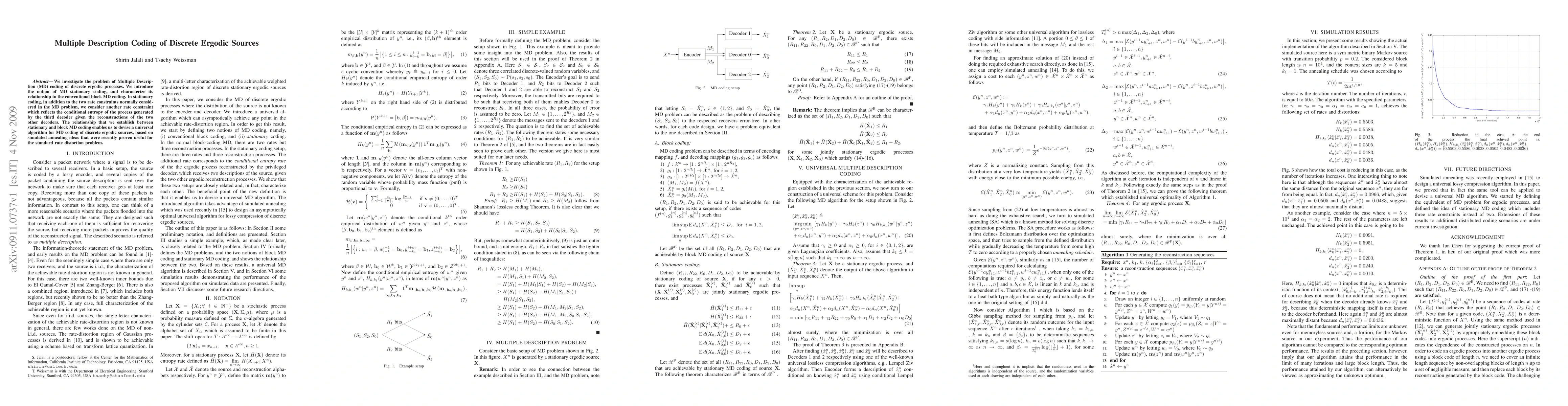 We investigate the problem of Multiple Description (MD) coding of discrete ergodic processes. We introduce the notion of MD stationary coding, and characterize its relationship to the conventional block MD coding. In stationary coding, in addition to the two rate constraints normally considered in the MD problem, we consider another rate constraint which reflects the conditional entropy of the process generated by the third decoder given the reconstructions of the two other decoders. The relationship that we establish between stationary and block MD coding enables us to devise a universal algorithm for MD coding of discrete ergodic sources, based on simulated annealing ideas that were recently proven useful for the standard rate distortion problem.