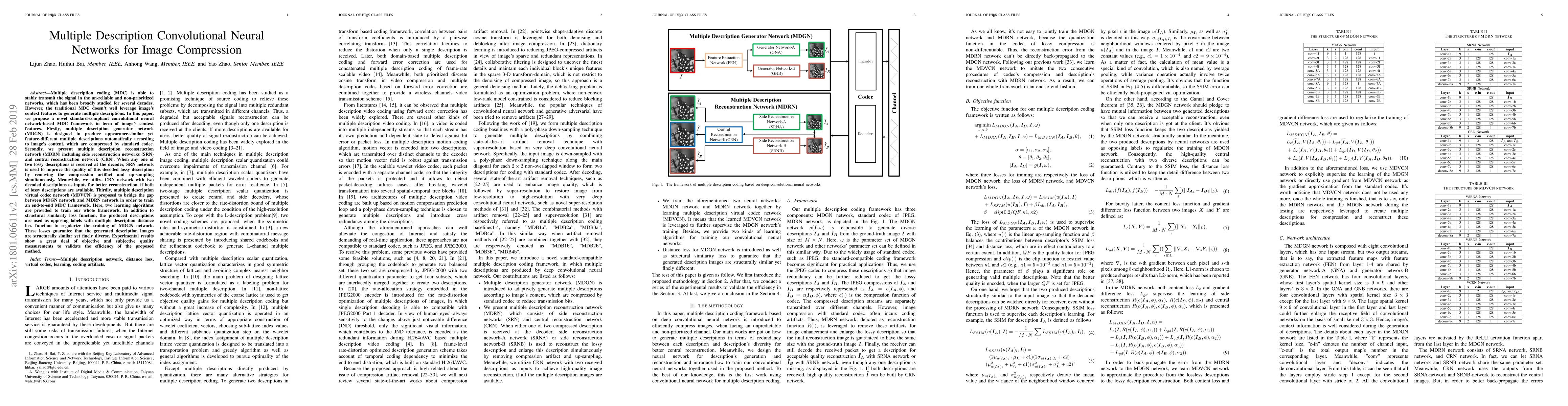 This paper proposes a convolutional neural network-based framework for multiple description coding (MDC) to improve image compression in unreliable networks. The framework includes a multiple description generator network (MDGN) to produce diverse yet appearance-similar descriptions, and a multiple description reconstruction network (MDRN) for improved reconstruction quality using side and central reconstruction networks.