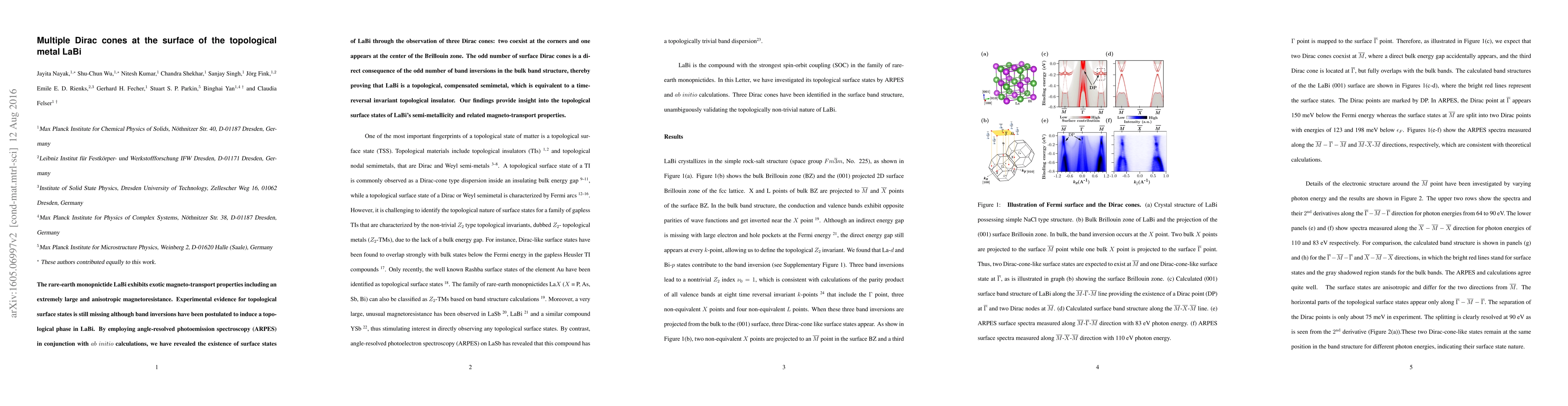 The study reveals that LaBi, a rare-earth monopnictide, hosts three surface Dirac cones, proving it to be a topological, compensated semi-metal with magneto-transport properties due to its unique band structure. This discovery is confirmed through ARPES and $ab~initio$ calculations.