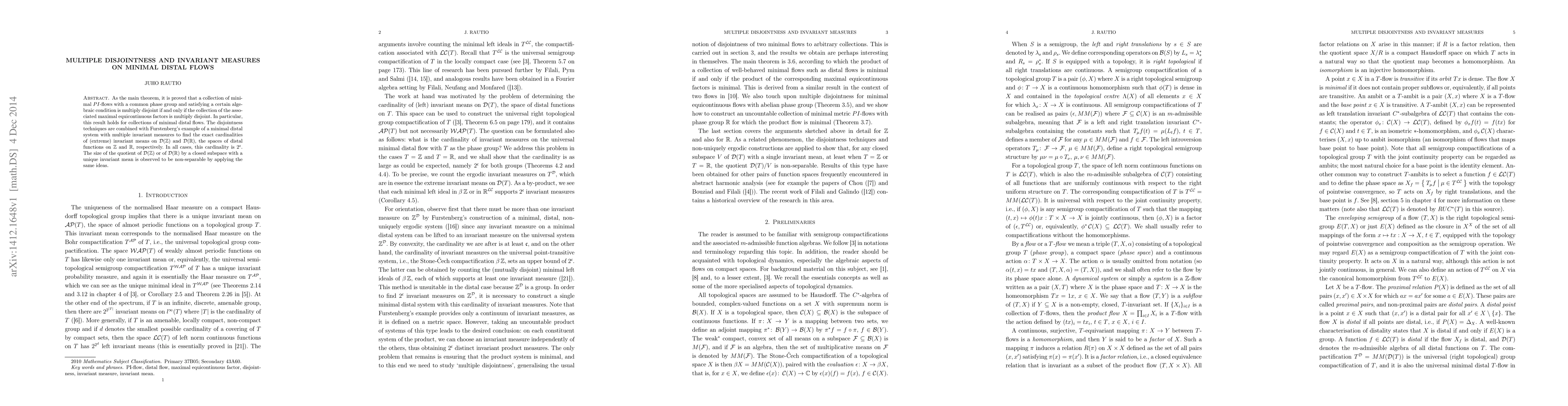 This paper proves that a collection of minimal $PI$-flows is multiply disjoint if and only if their maximal equicontinuous factors are multiply disjoint, specifically for minimal distal flows. It also determines the cardinality of invariant means on spaces of distal functions, finding it to be $2^{\mathfrak{c}}$, and shows non-separable quotients for spaces with unique invariant means.
