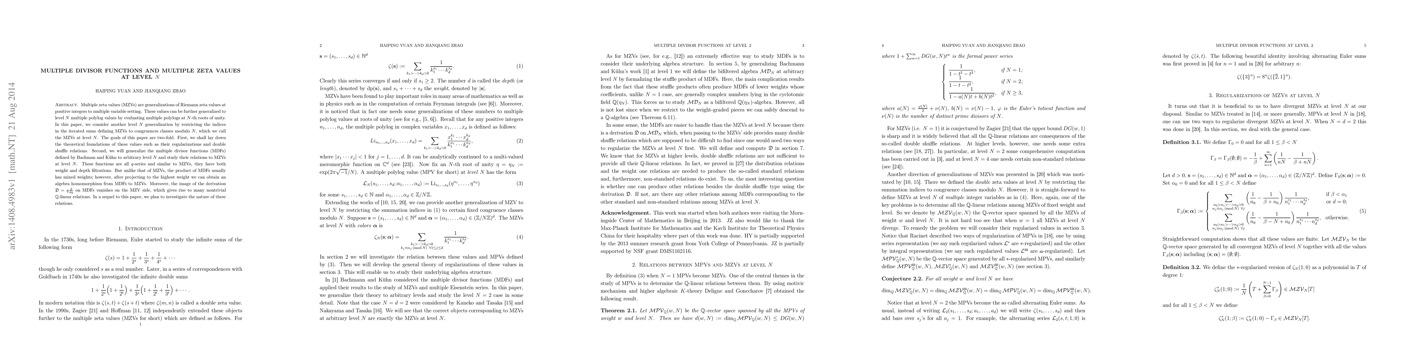 This paper establishes the theoretical foundations for multiple zeta values at level $N$ (MZVs at level $N$), including regularizations and double shuffle relations, and generalizes multiple divisor functions (MDFs) to arbitrary level $N$. It explores the algebraic relationships between MDFs and MZVs, highlighting nontrivial $\mathbb{Q}$-linear relations arising from the vanishing image of the derivation on MDFs.