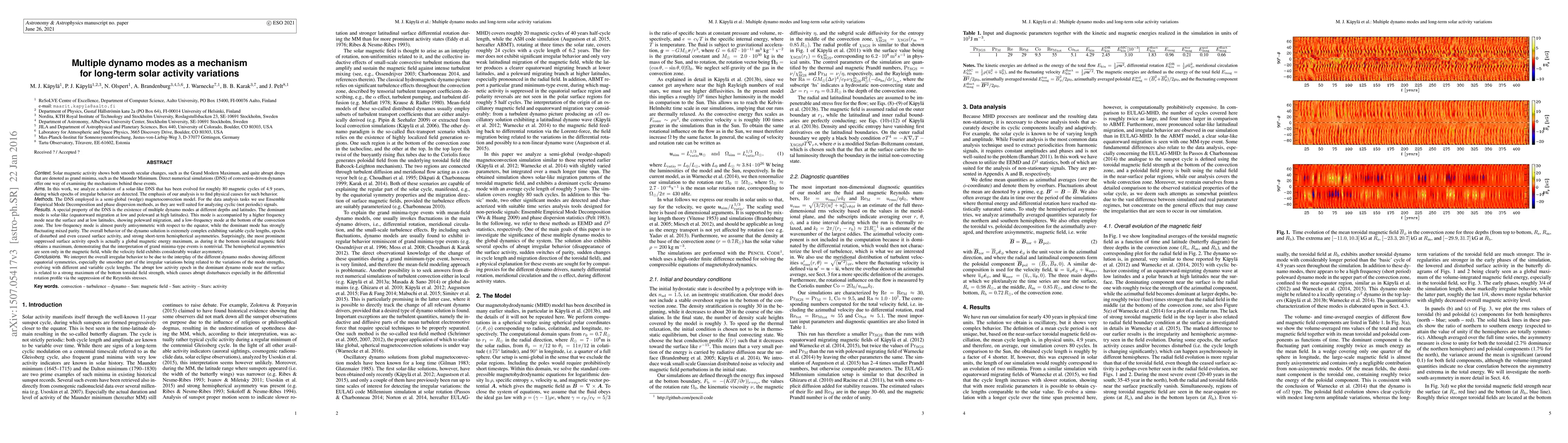 Solar magnetic activity shows both smooth secular changes, such as the Grand Modern Maximum, and quite abrupt drops that are denoted as Grand Minima. Direct numerical simulations (DNS) of convection driven dynamos offer one way of examining the mechanisms behind these events. In this work, we analyze a solution of a solar-like DNS that has been evolved for roughly 80 magnetic cycles of 4.9 years, during which epochs of irregular behavior are detected. The emphasis of our analysis is to find physical causes for such behavior. The DNS employed is a semi-global (wedge) magnetoconvection model. For data analysis we use Ensemble Empirical Mode Decomposition (EEMD) and phase dispersion ($D^2$) methods. A special property of the DNS is the existence of multiple dynamo modes at different depths and latitudes. The dominant mode is solar-like. This mode is accompanied by a higher frequency mode near the surface and a low-frequency mode in the bottom of the convection zone. The overall behavior of the dynamo solution is very complex exhibiting variable cycle lengths, epochs of disturbed and even ceased surface activity, and strong short-term hemispherical asymmetries. Surprisingly, the most prominent suppressed surface activity epoch is actually a global magnetic energy maximum. We interpret the overall irregular behavior to be due to the interplay of the different dynamo modes showing different equatorial symmetries, especially the smoother part of the irregular variations being related to the variations of the mode strengths, evolving with different and variable cycle lengths. The abrupt low activity epoch in the dominant dynamo mode near the surface is related to a strong maximum of the bottom toroidal field strength, which causes abrupt disturbances especially in the differential rotation profile via the suppression of the Reynolds stresses.