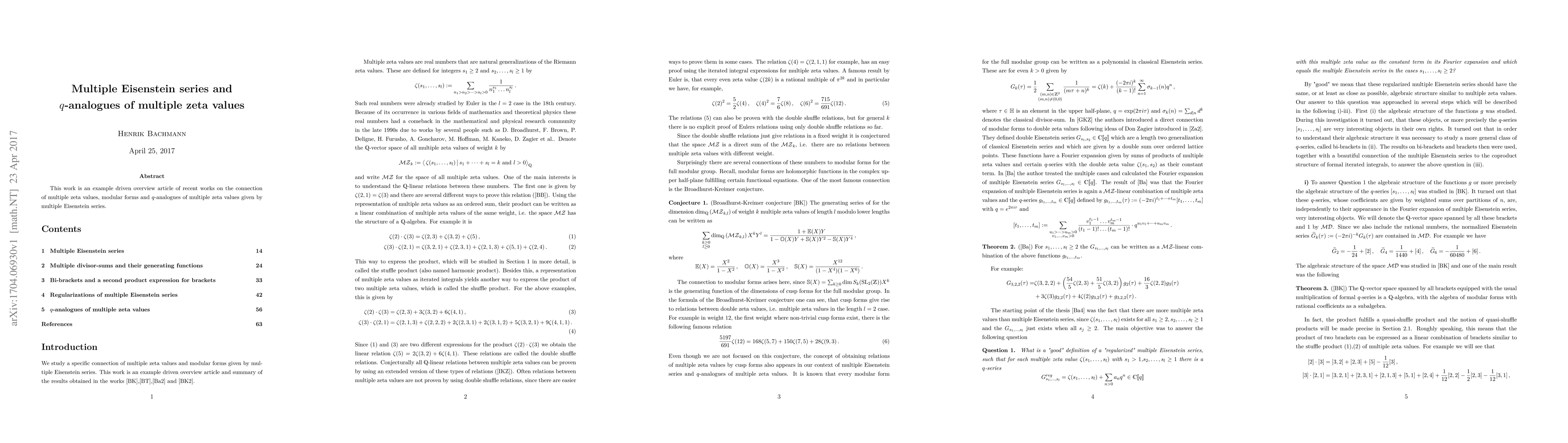 This paper provides an overview of recent developments linking multiple zeta values with modular forms and their q-analogues through multiple Eisenstein series. It emphasizes the mathematical connections and examples illustrating these relationships.